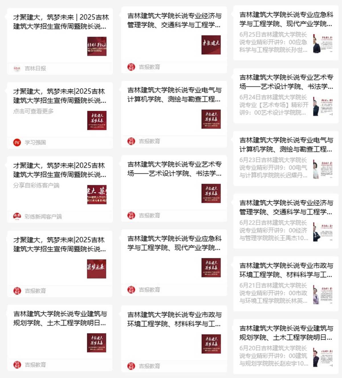 持续开展“才聚建大·筑梦未来”招生宣传周暨院长说专业直播活动。各学院院长、教授化身专业“代言人”,通过线上直播平台,权威解读办学优势、专业特色,进一步聚焦学校学科布局,全面呈现学校校园风采,深入解读本科招生专业。活动精心策划,覆盖考生关注关键期,相关内容通过吉林建筑大学招生视频号、学习强国、吉林日报彩练新闻、抖音等平台同步发布,总浏览量超50万人次,有效打破了地域限制,使建大情怀与专业魅力深入人心,云端引才品牌影响力持续扩大。