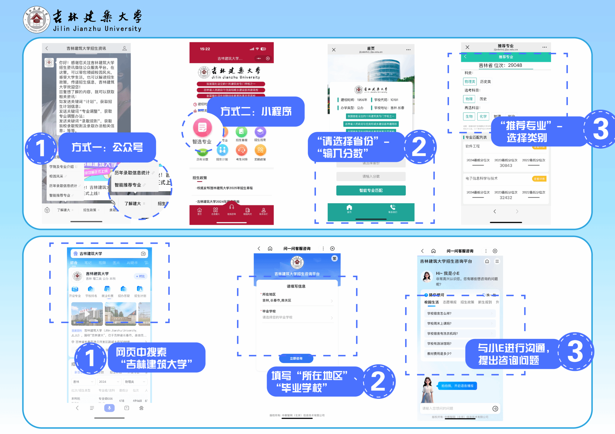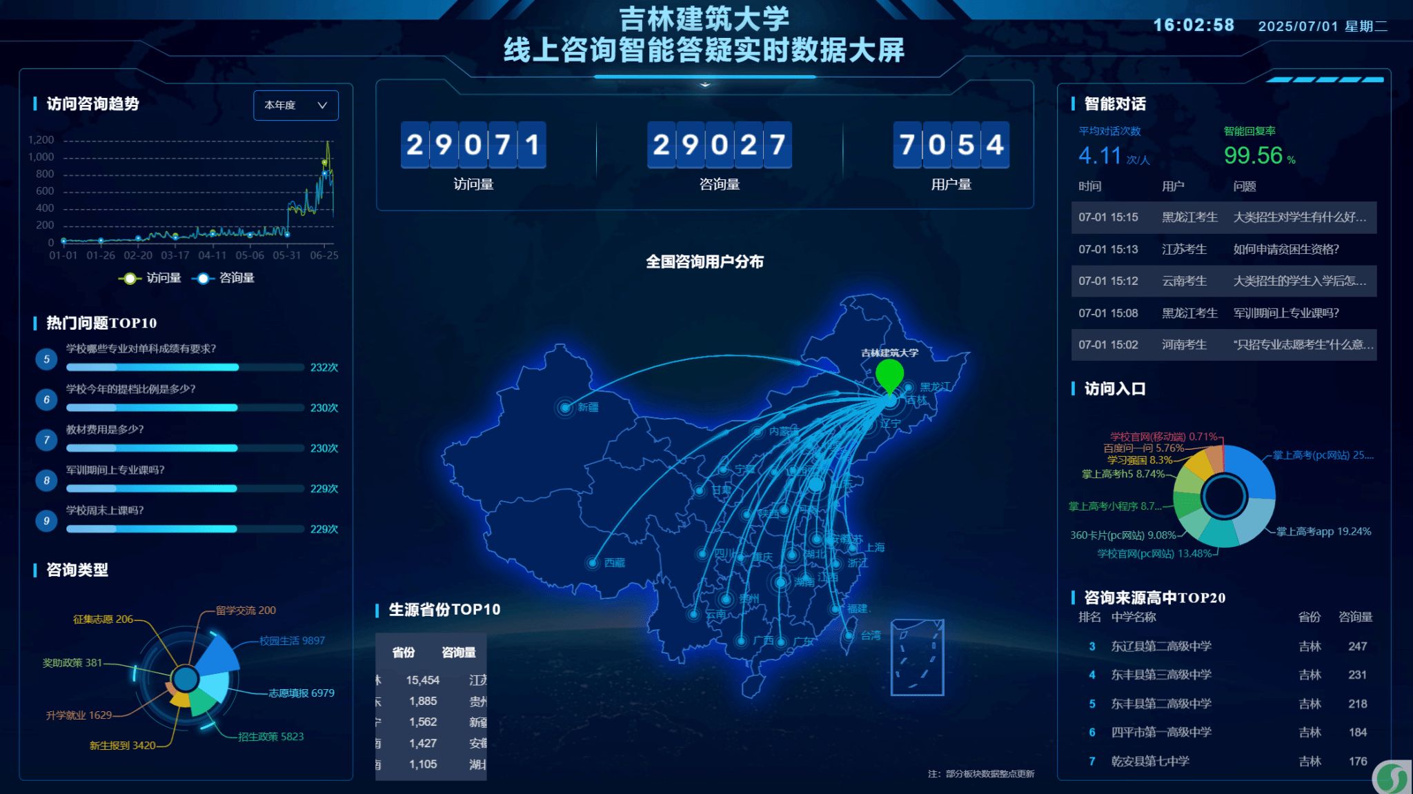学校积极推进数智赋能,拓展线上咨询服务渠道。2025年,学校首次引入数智技术赋能招生宣传工作,以DeepSeek智能问答、智能推荐专业为核心拓展线上咨询服务,打造“精准触达、智能交互、全周期陪伴”的招生服务体系,推动招生咨询从“信息传递”向“价值创造”的转型。截至目前通过掌上高考APP、吉林建筑大学招生信息网、百度搜索、360搜索、搜狗搜索、今日头条搜索、全国高校招生咨询答疑系统、学习强国等平台,累计接待考生访问量高达29071次,解答考生咨询次数29027次。