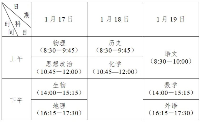 考试时间为2026年1月17日-19日。除语文科目考试时长为90分钟外,其他各科均为75分钟。具体安排如下: