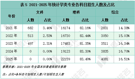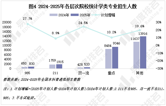 2025年所有层次院校的招生人数都在增加,共同推动了全国统计学类专业招生总规模的上升。985院校和双一流院校的招生计划增幅均超过20%,顶尖高校正在统计学类专业领域投入更多资源。