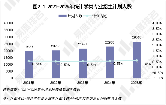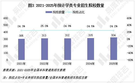 开设统计学类招生院校数量从2021年的305所增长到2025年的324所,五年间增加了19所,其占全国高校总数的比例基本维持在24%-25%的区间内。专业的布点速度与我国高等教育整体的规模扩张步伐基本保持一致。
