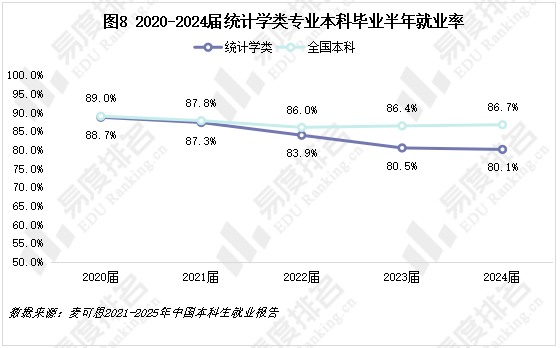 统计学类专业的本科毕业生就业率在近五年呈持续下降趋势,与全国本科平均水平的差距从基本持平逐渐拉大到超过6%。尽管专业招生规模在扩张,但毕业生在毕业半年内的就业形势正变得愈发严峻。