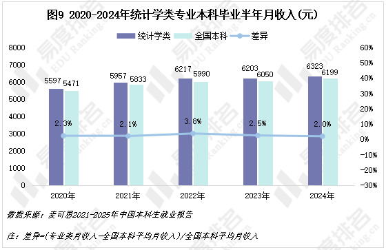 从短期收入来看,统计学类专业本科毕业生的绝对起薪持续增长且始终高于全国平均水平,市场价值依旧。然而,相对薪资优势在2022年达到峰值后,于近两年呈现出波动和收窄的迹象,供需关系的变化使得薪资的上涨压力减小,从而抑制了薪资溢价的进一步扩大。该专业类的薪资领先地位正在受到来自其他专业或市场整体变化的挑战。