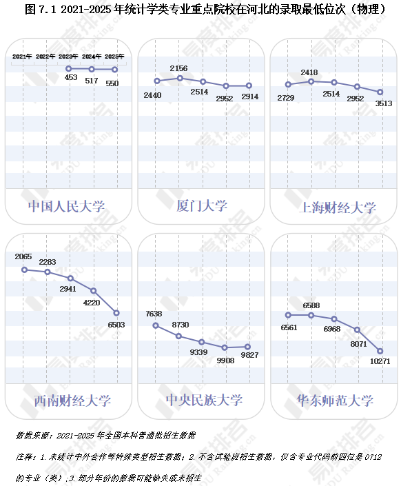 下图展示了在河北省录取位次位居前列的部分985、211院校统计学类专业(物理类)。统计学专业在顶尖生源市场的竞争强度已度过最高点,并开始呈现温和降温的态势。这些重点院校的统计学专业仍然是优质选择,与几年前相比,用同样的分数,现在有可能考入排名更靠前的大学。在考生心目中,统计学专业的优先级可能相对于计算机、人工智能等新兴热门专业有所调整,选择更加多元化。