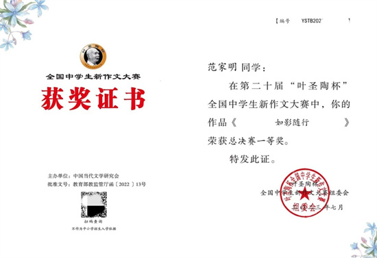 “叶圣陶杯”的参赛经历对我来说最重要的就是鼓励。它绝不仅仅是一次难忘的经历,参与其中我看到“相信”的力量。它告诉我:只要勇敢尝试,真诚表达,提起笔,坚持写,就能看见远方。