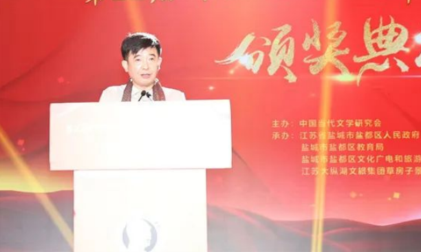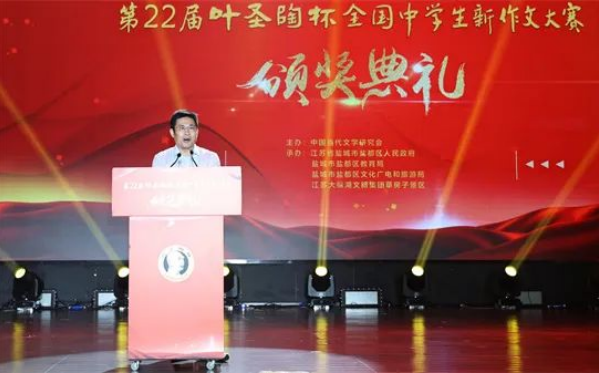 8月3日,第22届叶圣陶杯全国中学生新作文大赛颁奖典礼在盐城草房子景区隆重举行。大赛顾问、著名诗歌理论家、中国当代文学研究会原副会长、首都师范大学文学院教授吴思敬,著名作家、国际安徒生奖获得者、北京大学文学讲习所所长曹文轩,大赛评委会副主任、著名语文教育专家、人民教育出版社编审顾之川,著名文学评论家、全国政协委员、山东师范大学教授李掖平,叶圣陶先生孙女叶小沫,叶圣陶先生嫡孙叶永和,文学评论家、中国作家协会《文艺报》总编辑刘颋,一级作家、山东省作家协会主席团委员、青岛作家协会副主席、《青岛文学》杂志主编李林芳,文学专家、山东大学文学院常务副院长、教授、中国当代文学研究会校园文学委员会副理事长马兵,文学专家、南京师范大学国际交流学院院长、教授孙道功,校园文学专家、大赛组委会副主任王世龙,语言学专家、中国当代文学研究会校园文学委员会副理事长、中国传媒大学人文学院副教授蒋成峰等来自全国各地文学界、教育界、新闻出版界的知名专家学者齐聚一堂,与获奖师生代表共同见证这场文学盛宴,在文字的碰撞中传递教育初心,在思想的交流中点燃创作火种。盐城市委宣传部副部长、市文明办主任张孝荣,盐都区委常委、宣传部副部长吕杨,副区长陈晶晶等出席活动。