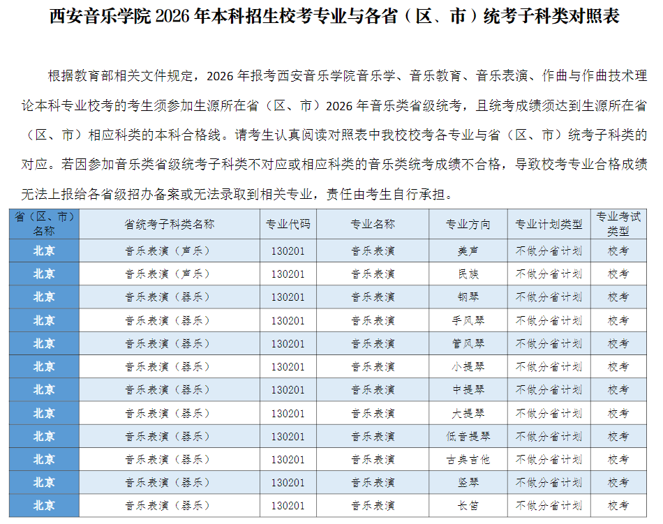 西安音乐学院2026年本科招生校考专业与各省(区、市)统考子科类对照表