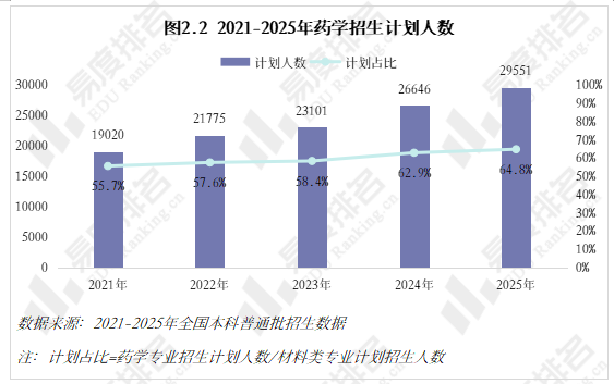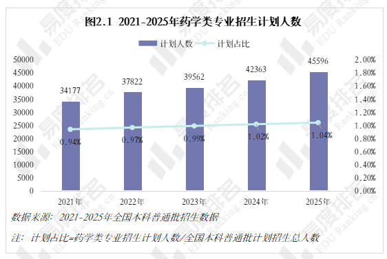 药学类专业正迎来高速发展时期,招生计划逐年增加,且增速加快。药学类开设专业以药学为主,2025年药学专业招生计划接近3万人,相比2021年增加超1万人,计划占比也高达64.8%。