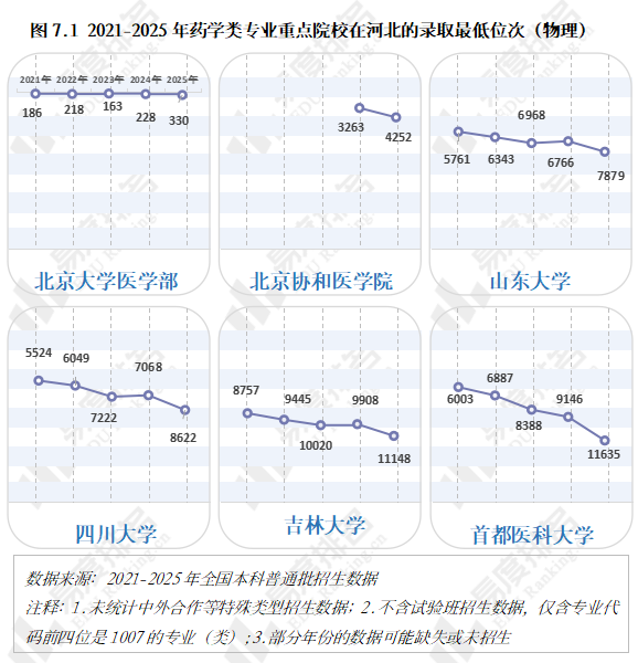 以河北省为例,下表展示了药学类专业排名靠前的六所高校历年录取位次。药学类专业的录取位次逐年下滑,整体的位次下降幅度远超计划扩招幅度,其中首都医科大学的录取位次更是翻了快一倍。