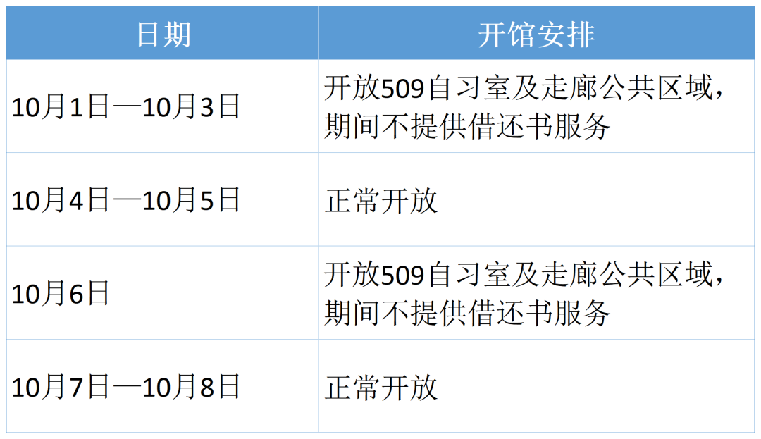 根据学校办公室《2025年国庆节、中秋节学校放假通知》安排,10月1日至10月8日放假,为给假期留校的师生读者们提供良好的学习场所,更好地服务读者,现将国庆、中秋节假期图书馆开馆安排如下: