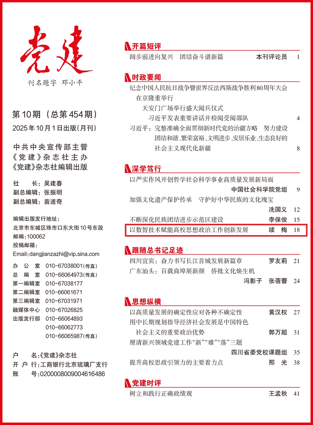 编者按:2025年10月1日,在学校建校70周年的重要历史节点,校党委书记续梅在2025年第10期《党建》杂志,发表题为《以数智技术赋能高校思想政治工作创新发展》的署名文章。
