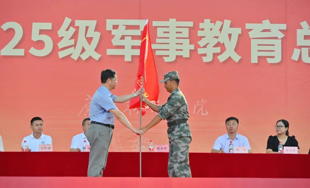“同学们,14天前,你们带着青春的激情与对未来的憧憬来到大学校园;14天来,你们在军训团旗的引领下,经历烈日炙烤、汗水洗礼、始终服从指挥,严格训练。你们每一次咬牙坚持、每一滴拼搏汗水,都生动诠释了军训精神的深刻内涵,也为大学生活写下浓墨重彩的第一笔。可以说,在军训这场意志与品格的考验中,你们每一个人,都是合格者!军训期间,军训团的全体教官严格要求,认真带训,以良好的军事素养和负责精神确保了军训的质量,展现了教官的应有风彩、各学院领导,辅导员、导师导生,学校相关职能部门的有关老师,后勤部门员工和安保工作人员对军训工作给予了关心指导,提供了有力保障。”校长张强、党委书记刘友坤代表学校,分别向广州校区、江门校区顺利完成军事教学训练任务的2025级同学们表示热烈祝贺,向辛勤付出的教官和师生员工们表示衷心感谢。