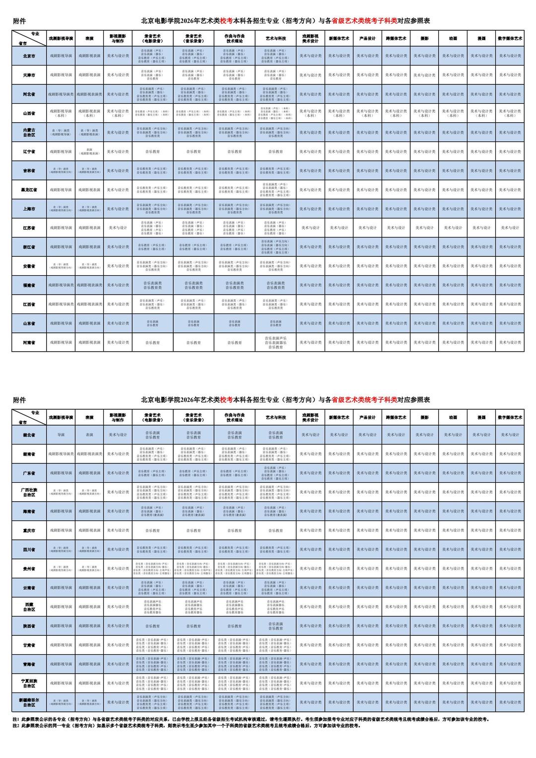北京电影学院 2026年艺术类本科校考专业与省级统考子科类对照表