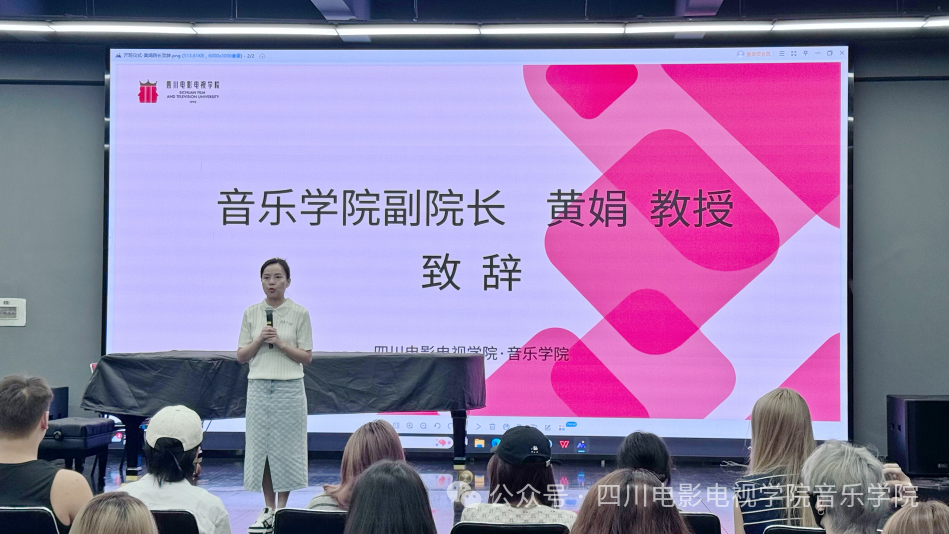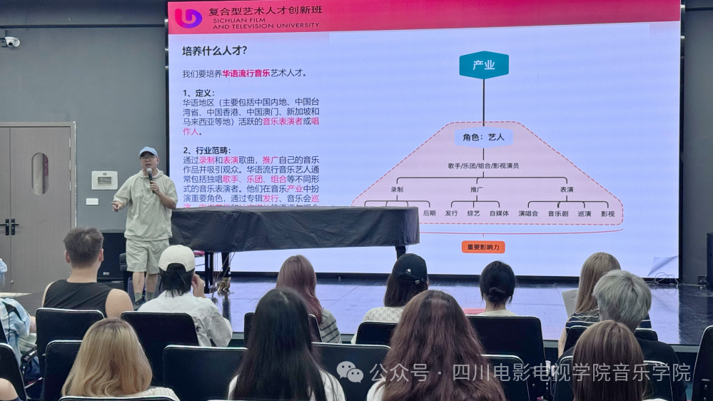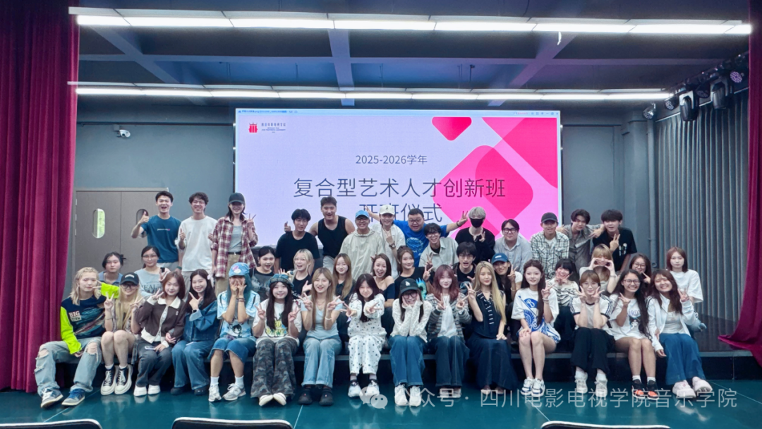 为贯彻落实“以产业需求为导向,培养复合型艺术人才”的教学理念,推动“流行音乐+数字技术+舞台实践”跨界融合教育模式落地,四川电影电视学院音乐学院于2025年9月17日中午在艺步楼112实训室隆重举行2025-2026学年复合型艺术人才创新班开班仪式。副院长黄娟教授出席仪式并致辞,声乐(流行)教研室主任文智敏、艺术实践教研室负责人彭鹏、创新班负责教师李霜及创新班全体40名学员共同参与。据悉,这是复合型艺术人才创新班正常运行的第三年,已为行业输送了多名优质的舞台艺术人才。
