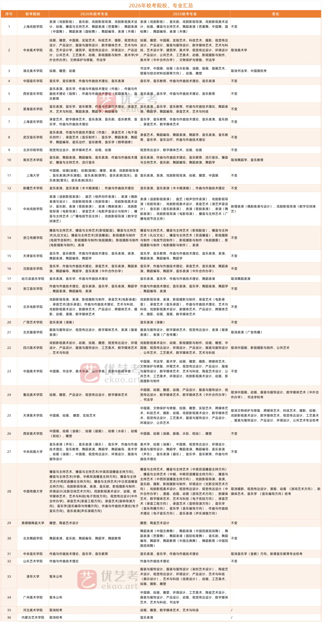 目前,仅剩清华大学美术学院和广州美术学院公布2026年艺术类校考专业暂未公布,其余校考院校纷纷公布今年校考的专业,来看看今年都有哪些变化。