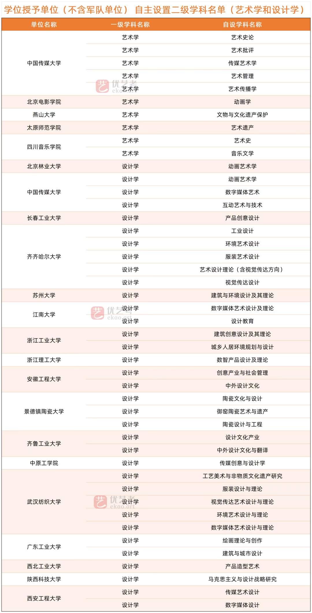10月11日,教育部公布学位授予单位(不含军队单位)自主设置二级学科和交叉学科名单。优艺考整理发现,不少高校申报自主设置二级学科,且多所高校设置艺术学和设计学2个一级学科和若干自设学科。自主设置艺术学和设计学科的高校中,多为设计学实力、或艺术知名度较高较强的高校。
