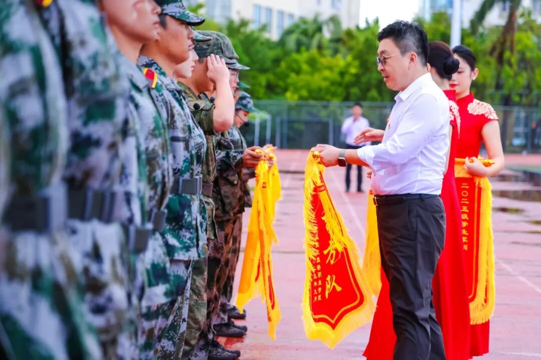 随后,海航航空集团党委书记、三亚航院理事长高建向部队首长赠送锦旗。锦旗上的烫金文字,不仅承载着学校对部队教官们辛勤付出的诚挚感谢,更见证了 “军民同心育英才” 的深厚情谊。军训期间,教官们以严谨的态度、专业的指导,将纪律意识、团队精神传递给每一位新生;如今,这面锦旗成为纽带,让这份温情与协作,继续在航院的育人路上延续。