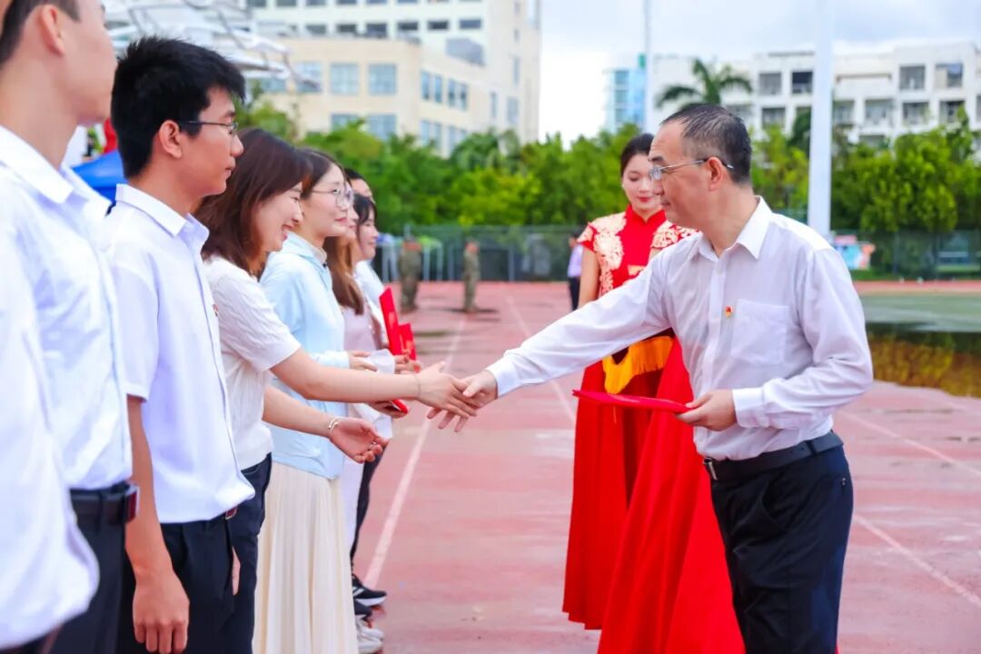 机电工程学院的侯哲老师作为教师代表登台,为新生们送上三份饱含期许的 “成长锦囊”。第一份是 “以匠心为基”,他鼓励同学们在实训室里精益求精,在操作台前一丝不苟,将专业技能练到 “天花板级别”,练就立足社会的 “硬核实力”;第二份是 “以创新为帆”,他提醒大家打破专业界限,主动探索 “人工智能 +”“数字 +” 与专业的融合,在跨界学习中成长为复合型人才;第三份是 “以时代为海”,他叮嘱同学们珍惜海南自贸港建设的机遇,夯实基础、提升素养,在这片热土上书写青春华章。侯哲老师还承诺,全体教师将做新生的 “引路人”“导航仪” 与 “加油站”,陪伴大家在求学路上稳步前行。