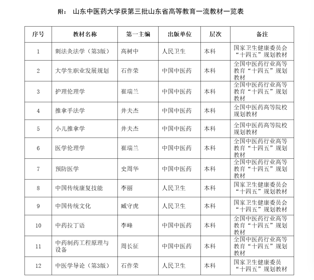 山东省教材委员会办公室下发《关于公布第三批山东省普通高等教育一流教材名单的通知》,我校12种教材获第三批山东省普通高等教育一流教材,获批数量位居省属高校前列、全省医学院校首位。