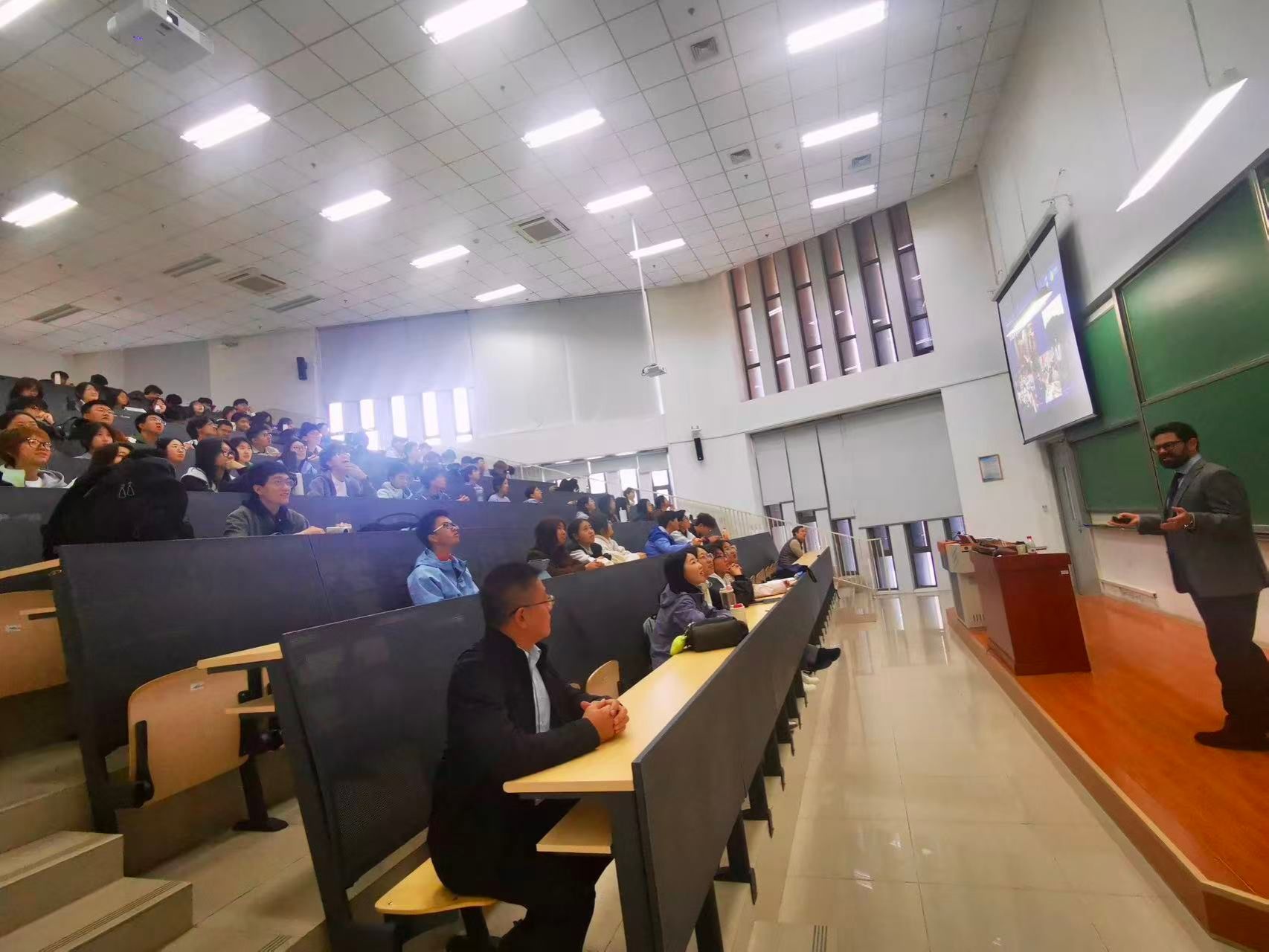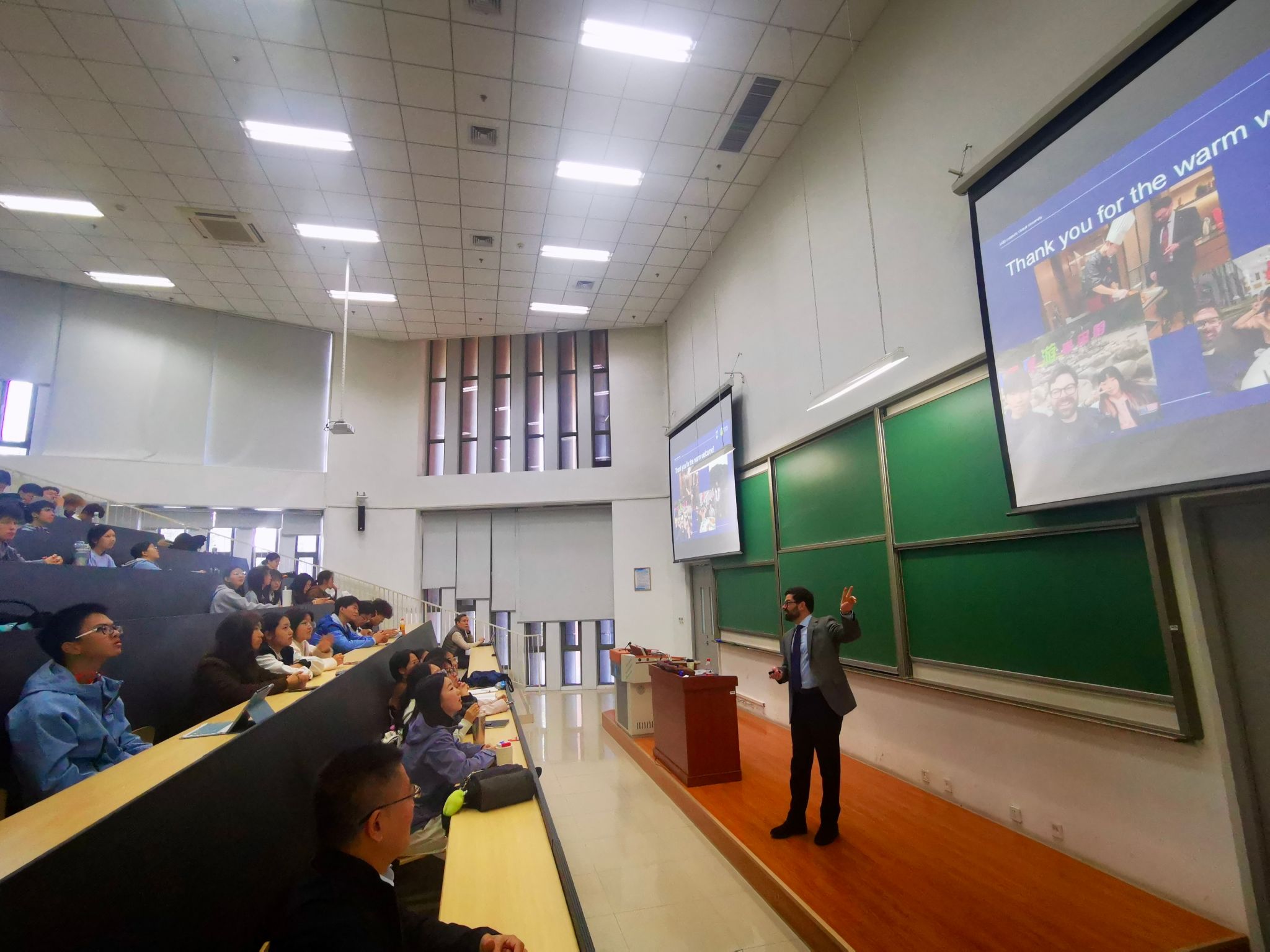 10月13日,Benjamin Elsner 院长进一步与金融学专业学生展开座谈,并作专题学术讲座,系统介绍了国际经济与金融领域的前沿动态与发展趋势。讲座有效拓展了学生的专业视野,增强了学生对学科内涵的理解。现场互动热烈,学生提问踊跃,展现出良好的学术氛围。