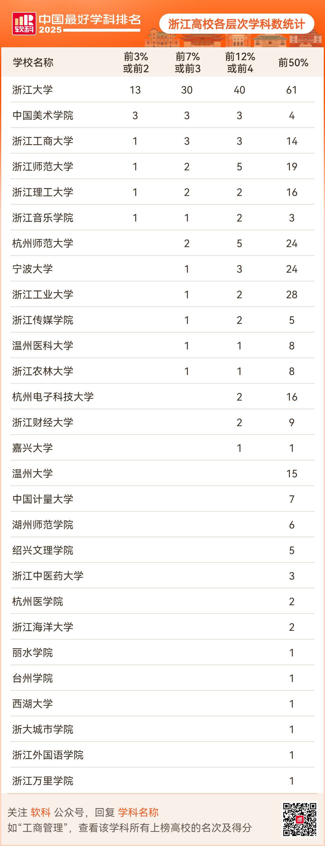 10月15日,软科正式发布“2025软科中国最好学科排名”,28所浙江高校有286个学科上榜。浙江工商大学有1个学科位列全国前3%,3个学科位列全国前7%,3个学科位列全国前12%,14个学科位列全国前50%,在浙江高校各层次学科数统计中位列浙江省前三。工商管理学进入到中国顶尖学科(前3%),仅次于北京大学。