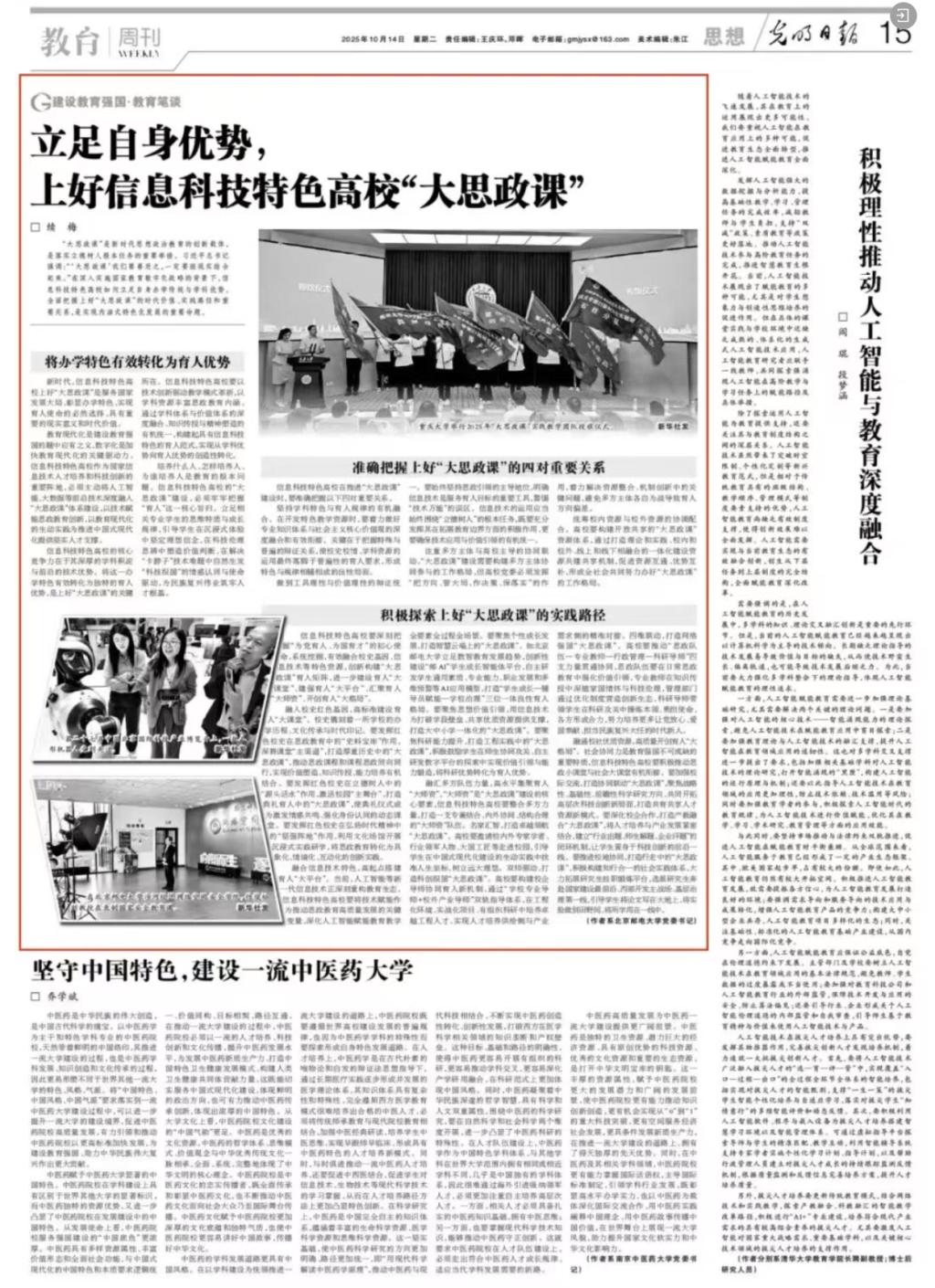 聚焦新时代“大思政课”,实现信息科技特色高校内涵式特色化发展。10月14日,《光明日报》刊发校党委书记续梅署名文章《立足自身优势 ,上好信息科技特色高校“大思政课”》。