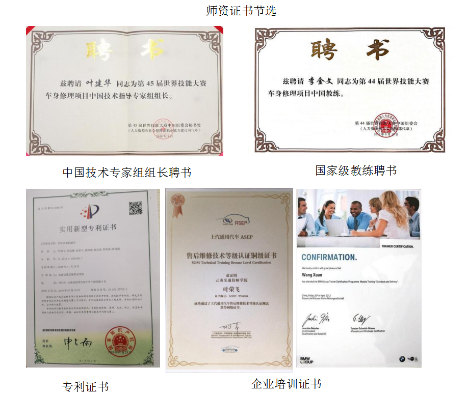 目前本专业有专任教师50人,外聘专家3人。专任教师团队有世界技能大赛中国队教练1人、国家级裁判2人、全国技术能手2人、云岭首席技师2人、全国青年岗位 能手1人、全国交通教育优秀教师2人、云南省技术能手3人、云南十佳能工巧匠1人, 通过宝马、保时捷、奥迪、上汽通用、上汽大众、PPG等企业认证30人,一半以上专任教师均具备丰富的企业工作经验。23人参与并出版专业课程教材,10人申报过专 利,20余人次获得各类奖项和荣誉。外聘专家团队有世界技能大赛中国专家组组长、世界技能大赛世界冠军获得者、企业高级培训经理。