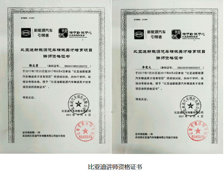 本专业专任教师教学团队36人,汽车公共基础课教师13人,专业课教师23人。高级职称 教师12人,占比33.3%,具有硕士学位5人。14名教师具有企业工作经历,所有教师有企业实 习经历。13名教师取得企业技术认证。实训指导教师均取得职业资格认证。其中专业带头人 郭志勇老师为西南林学院交通运输专业本科毕业,昆明理工大学交通工程硕士在读,讲师; 全国新能源汽车服务技能大赛裁判、螳川人才;中国汽车诊断师大赛全国三等奖获得者;比 亚迪公司认证新能源汽车技术培训师、北汽新能源汽车公司认证培训师、宝马汽车公司认证 技术培训师、神龙汽车公司认证培训师;参加并完成了专业带头人领军能力研修-汽车运用与 维修(国培计划),取得全国交通运输职业教育骨干教师培训认证;发表新能源汽车技术核 心期刊论文3篇,主编出版新能源汽车技术专业教材一本,取得9项专利技术。