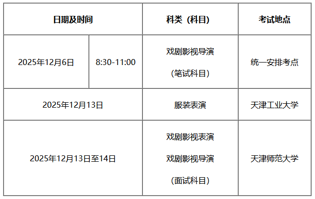 表(导)演类市级统考分为戏剧影视表演、戏剧影视导演、服装表演三个方向,考生须选择其中一个方向参加考试。考试时间及地点安排如下: