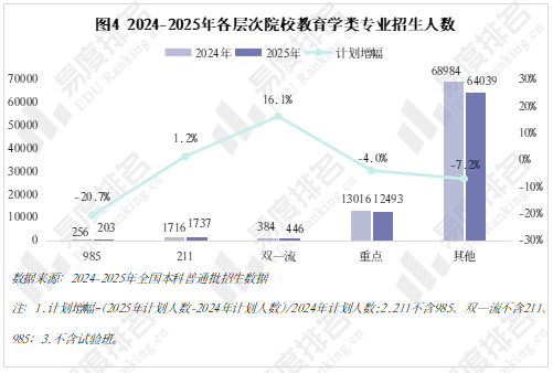 2025年教育学类专业双一流及以上层次高校计划占比仅3%,计划主要集中在重点及其他层次高校。其中985高校计划降幅最大,相比去年减少了20.7%。顶尖高校是风向标,其在教育学类专业招生的调整未来也将引导其他较低层次高校跟进,各层次高校将全面缩减教育学类专业的招生计划。
