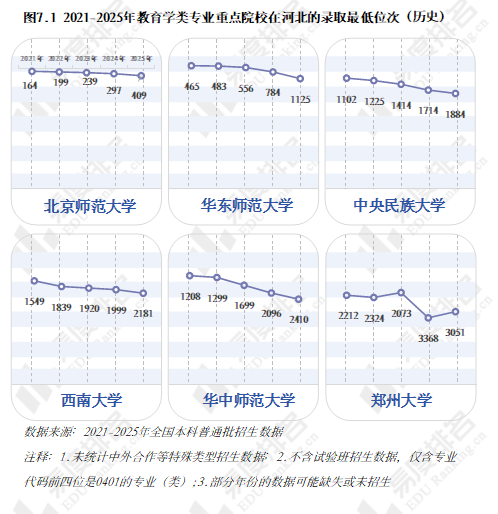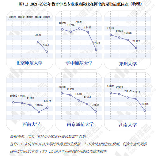 基于当前的就业形势,考生们更多从现实出发,不盲目追求学校名气,更加看重专业以及未来的就业前景。出生人口下降,教育学类专业毕业生的出路也变窄,考生转而报考就业前景更好热度更高的专业,即使是985、211高校,教育学类专业报考热度也急剧下滑,以在河北招生的部分985、211院校举例,重点高校教育学类专业的录取位次全面下滑。