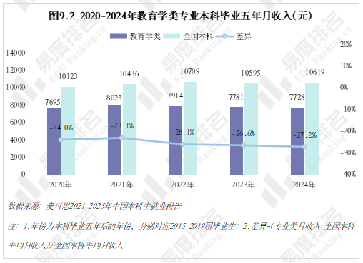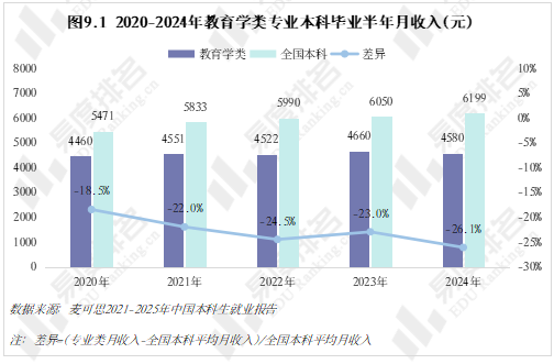 近年教育学类毕业半年的薪资在各专业类中始终处于垫底位置,与全国本科平均薪资的差距也在逐步扩大,2024年毕业半年的薪资差距已达到26.1%。