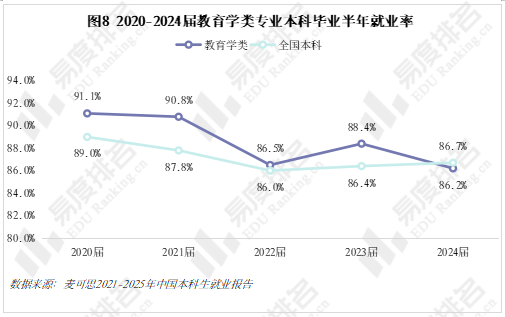 往年教育学类专业毕业生就业率始终高于全国本科平均水平,2024届毕业生就业率首次低于平均水平。大众对教师的普遍印象是工作稳定,但目前的难题在于毕业后难以就业,在本科平均就业率总体企稳回升的前提条件下,教育学类专业毕业生就业率仍在下滑,尤其是社会对幼师、小学教师的需求减少,未来教育学类专业毕业生就业形势仍不容乐观。