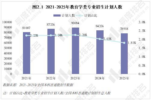 近年我国普通本科招生规模持续增长,教育学类专业2021-2023年招生计划同步增长,到2024年迎来拐点,计划招生人数急转直下,到2025年计划人数降至7.89万人,相比2023年的高点减少了12.4%。