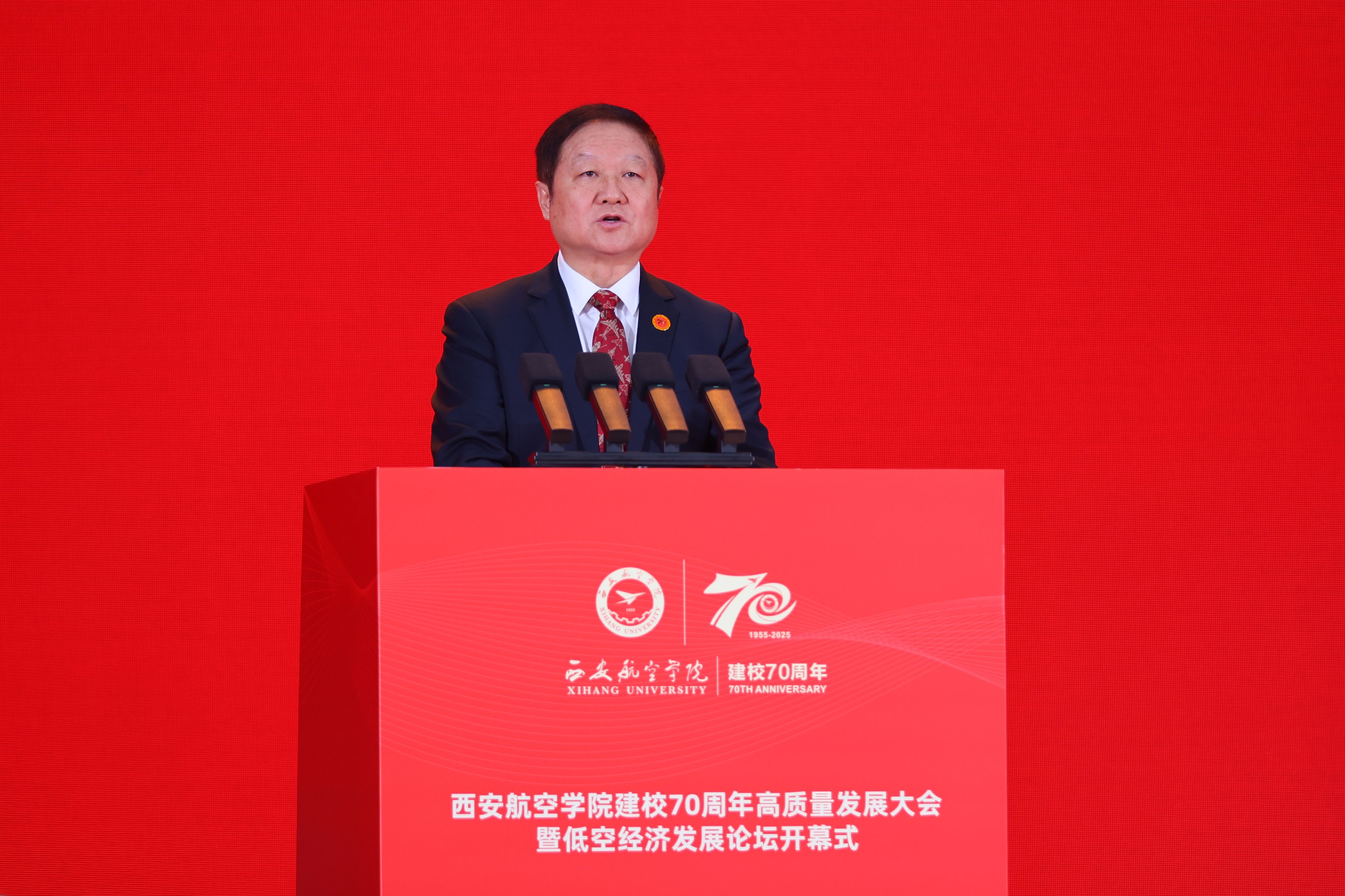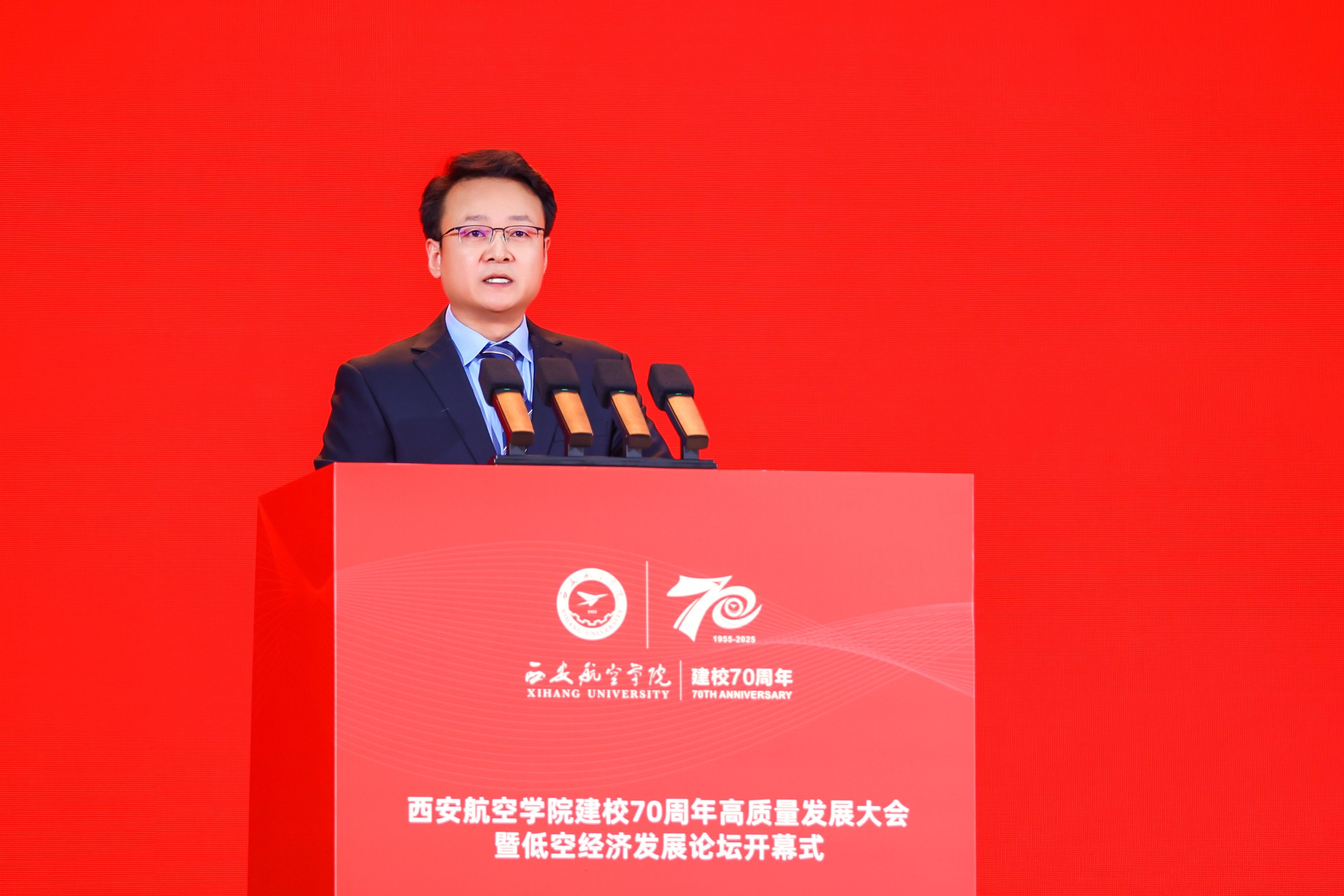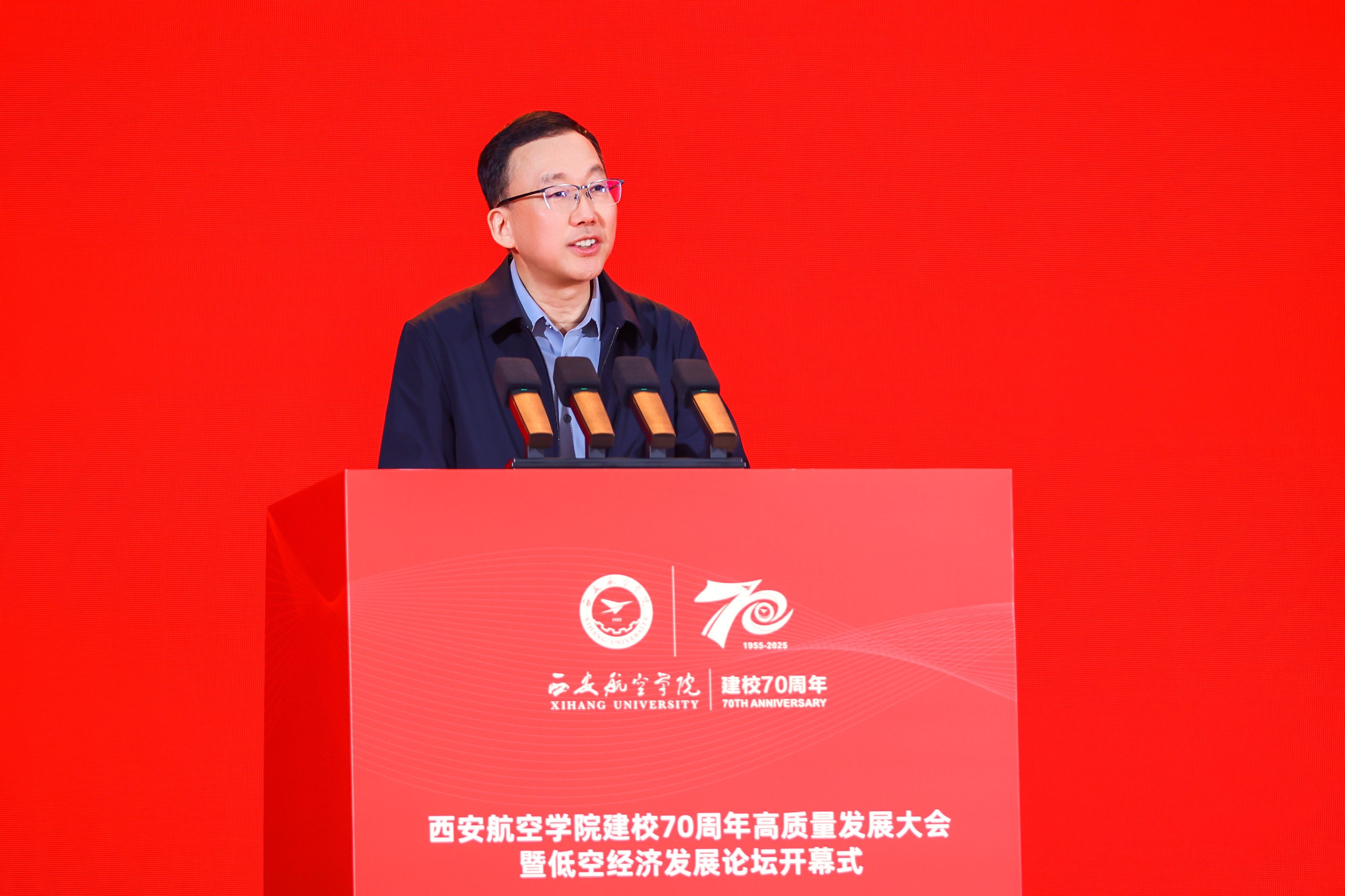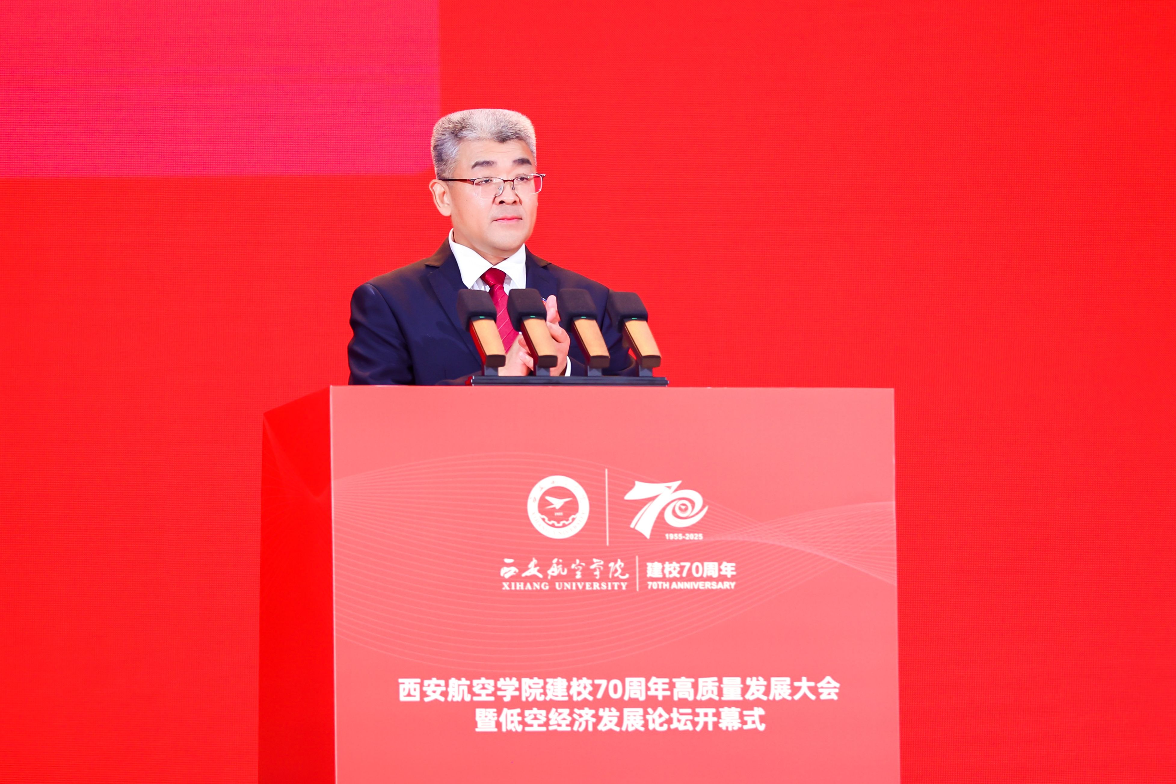10月15日上午,西安航空学院建校70周年高质量发展大会暨低空经济发展论坛开幕式在学校阎良校区隆重召开。陕西省人民政府副省长李钧,中国航空工业集团有限公司党组副书记、董事李清堂,中国科学院院士、西北工业大学教授张卫红,中共陕西省委副秘书长王利,陕西省人民政府副秘书长徐刚,中共陕西省委教育工委书记、省教育厅厅长王树声,国防科工局科技司辜坚,中国航发西安航空发动机有限公司党委副书记唐宏伟,中国商飞上海飞机制造有限公司党委副书记曹印诺出席会议,省市有关领导、院士专家、兄弟高校、合作单位嘉宾,海内外校友以及学校师生代表等1300余人参加大会。西安航空学院党委书记祁玉龙主持会议。