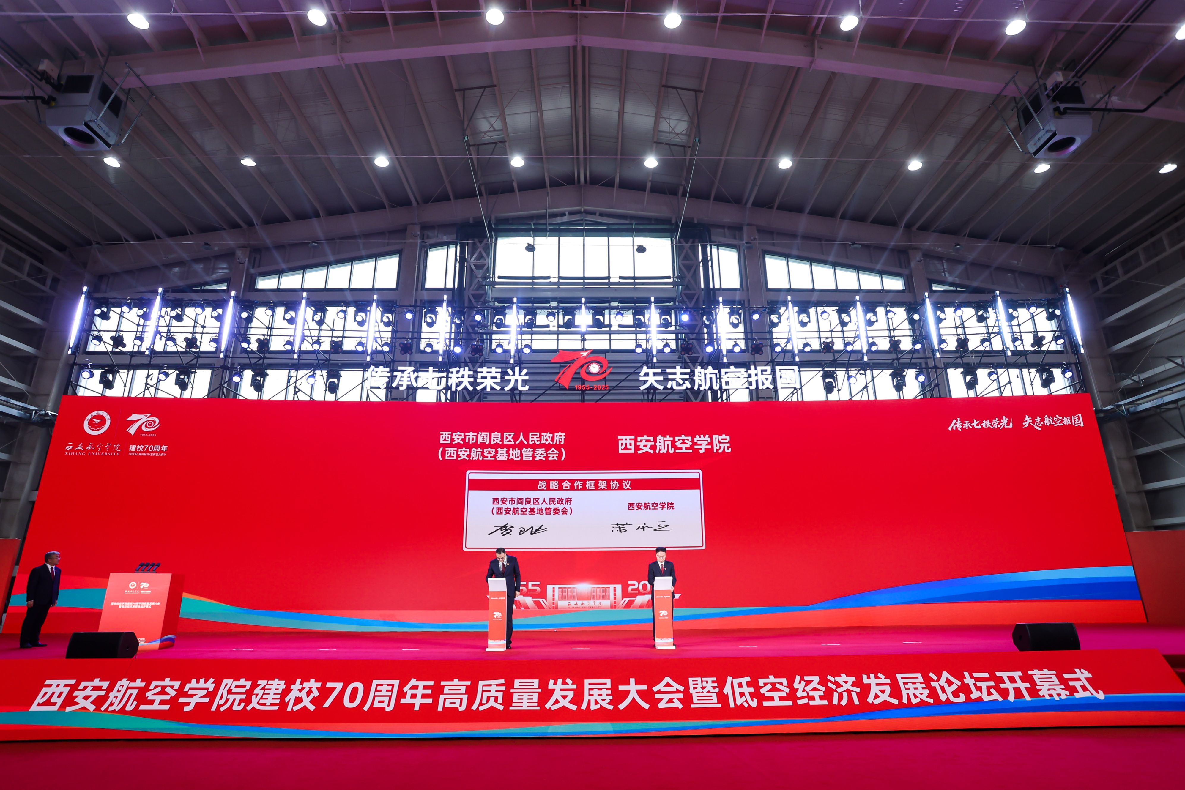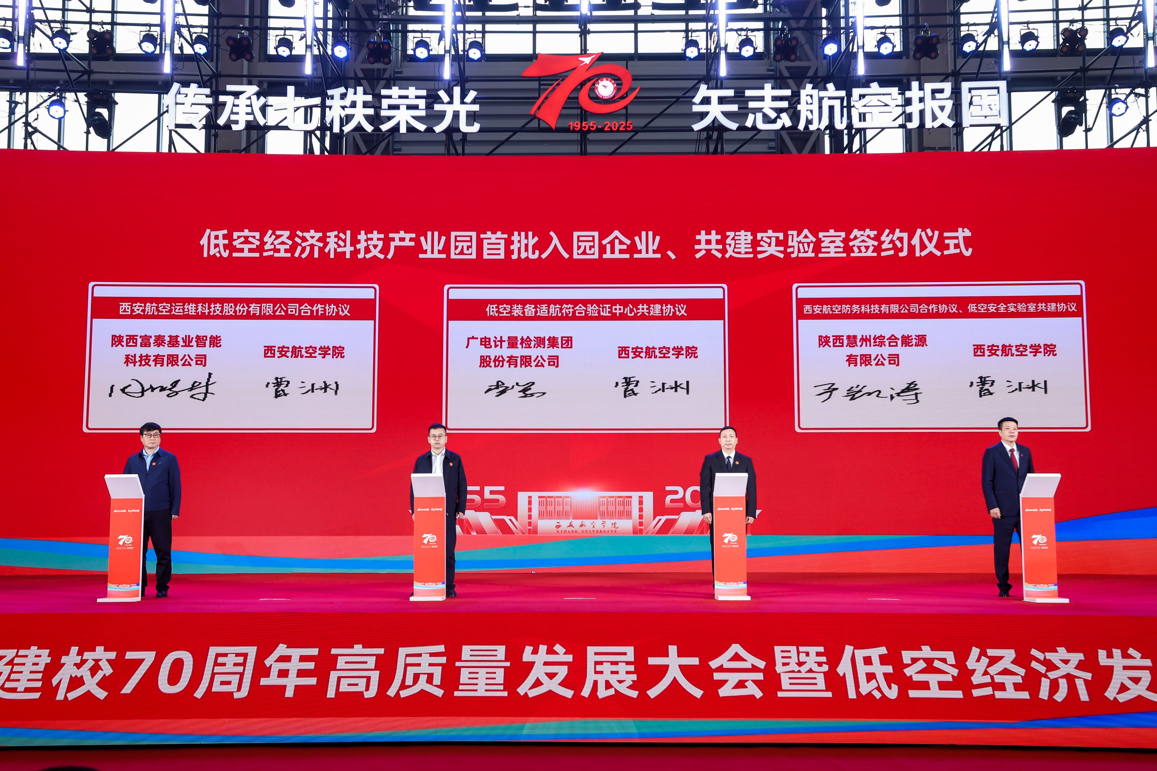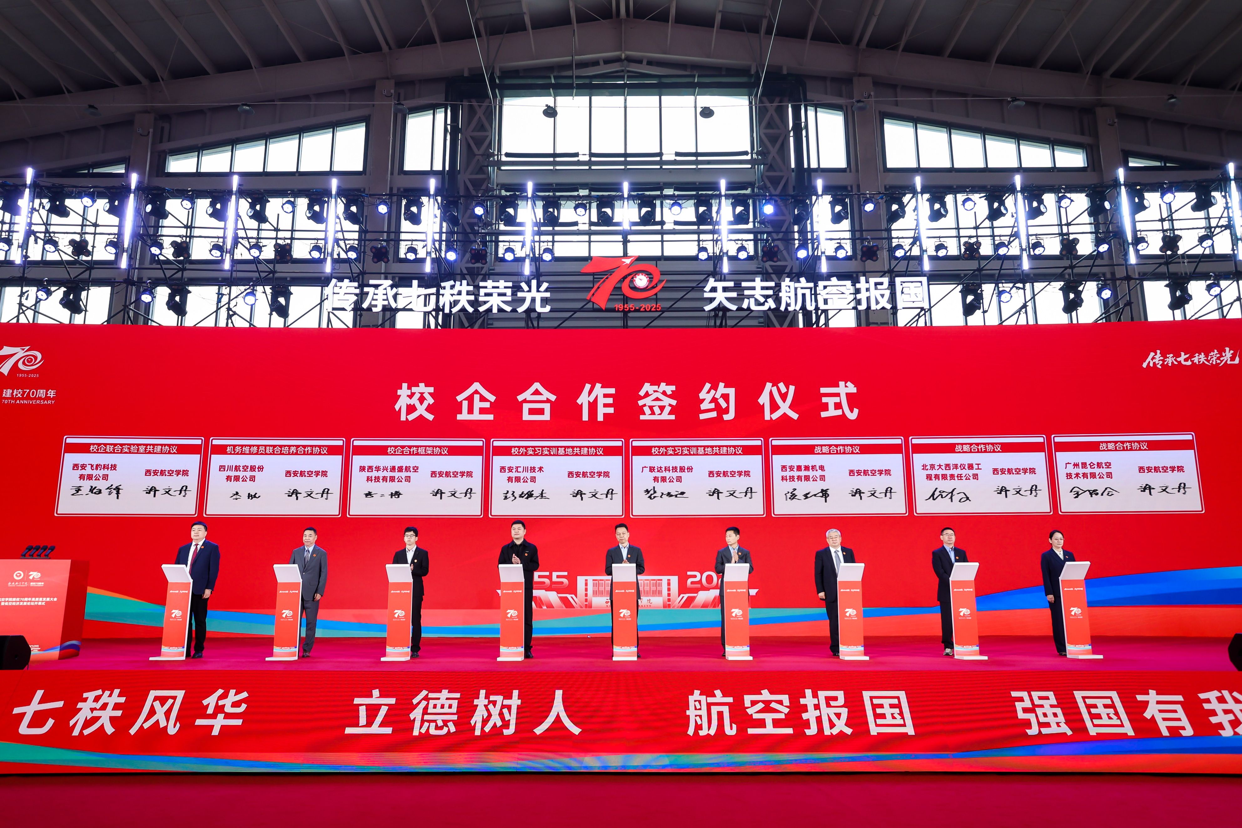 签约环节,学校“中国航空工业集团有限公司产教融合培训基地”“中国航空发动机集团有限公司产教融合培训基地”“中国商飞民机总装制造现场工程师培养基地”揭牌;与阎良区人民政府(西安阎良国家航空高技术产业基地管理委员会)签订全面战略合作协议;与广电计量检测集团股份有限公司、陕西慧州综合能源有限公司、陕西富泰基业智能科技有限公司等3家企业签订首批入驻学校低空经济科技产业园《进驻协议》;与西安飞豹科技有限公司、四川航空股份有限公司、陕西华兴通盛航空科技有限公司、西安汇川技术有限公司、广联达科技股份有限公司、西安嘉瀚机电科技有限公司、北京大西洋仪器工程有限责任公司、广州昆仑航空技术有限公司等8家合作企业、校友企业签订《合作协议》。
