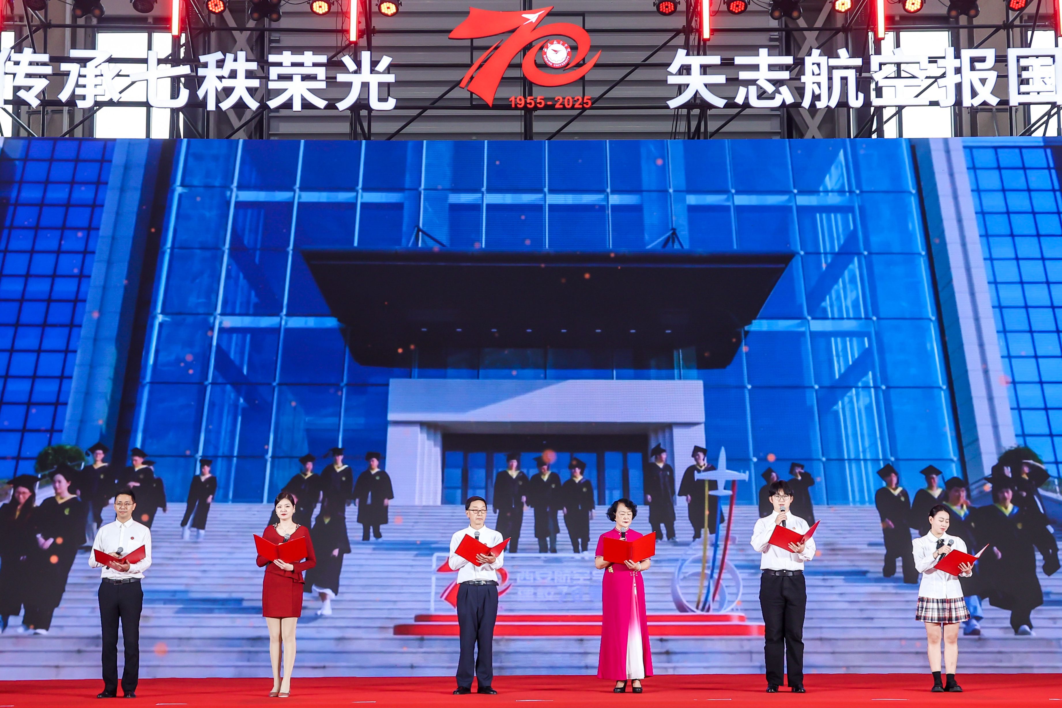 学校师生代表深情朗诵情景诗《七秩芳华》,表达对伟大祖国和学校的热爱之情,以及“航空报国、航空强国”的坚定信念。