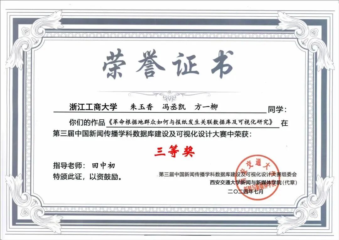 图为中国新闻史数据可视化比赛奖状