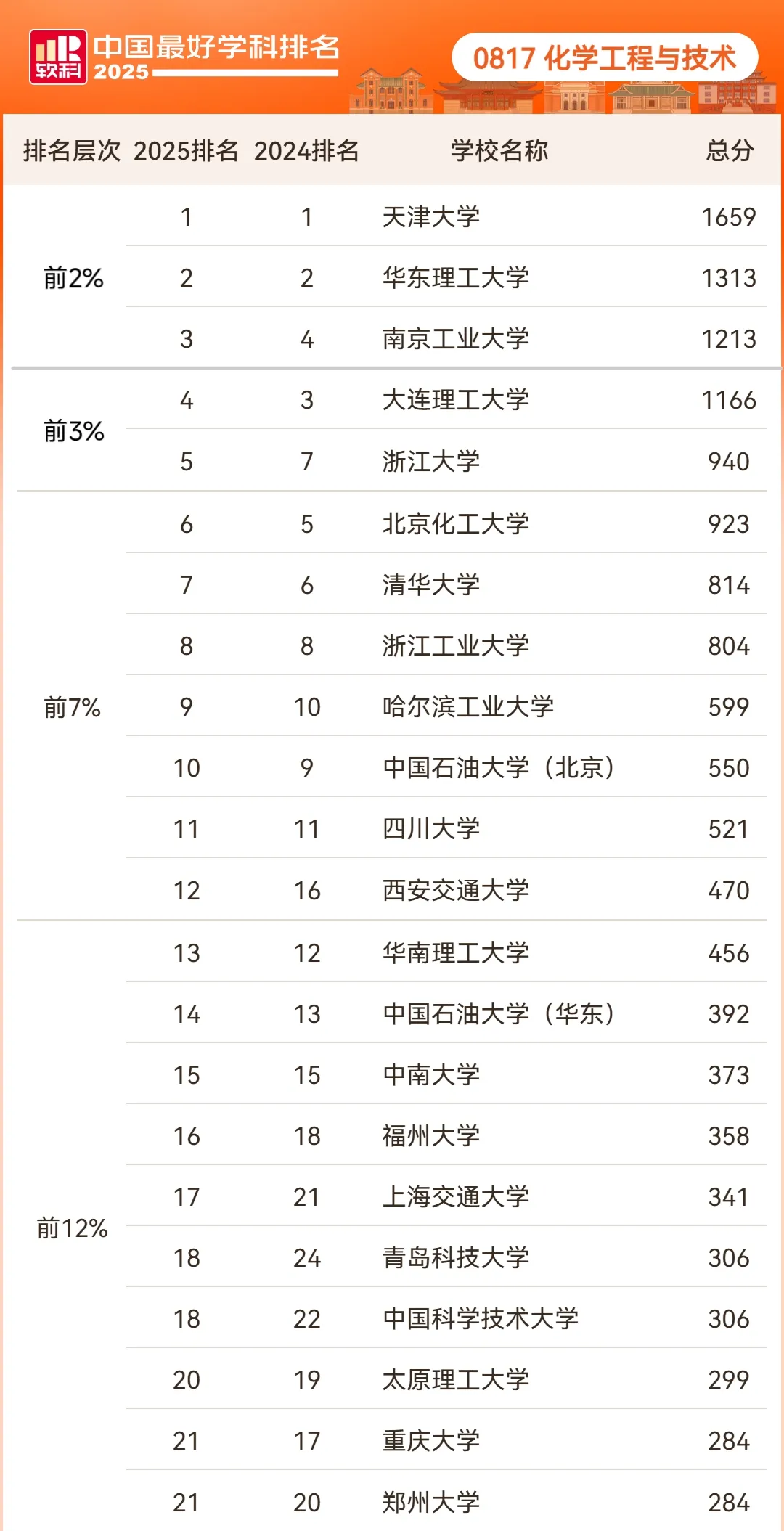 10月15日,高等教育评价专业机构软科正式发布“2025软科中国最好学科排名”。我校化学工程与技术学科表现突出,位列全国第三,进入该学科排名前2%,跻身“中国顶尖学科”行列,较往年有所提升,展现出学科发展的稳健态势与持续竞争力。