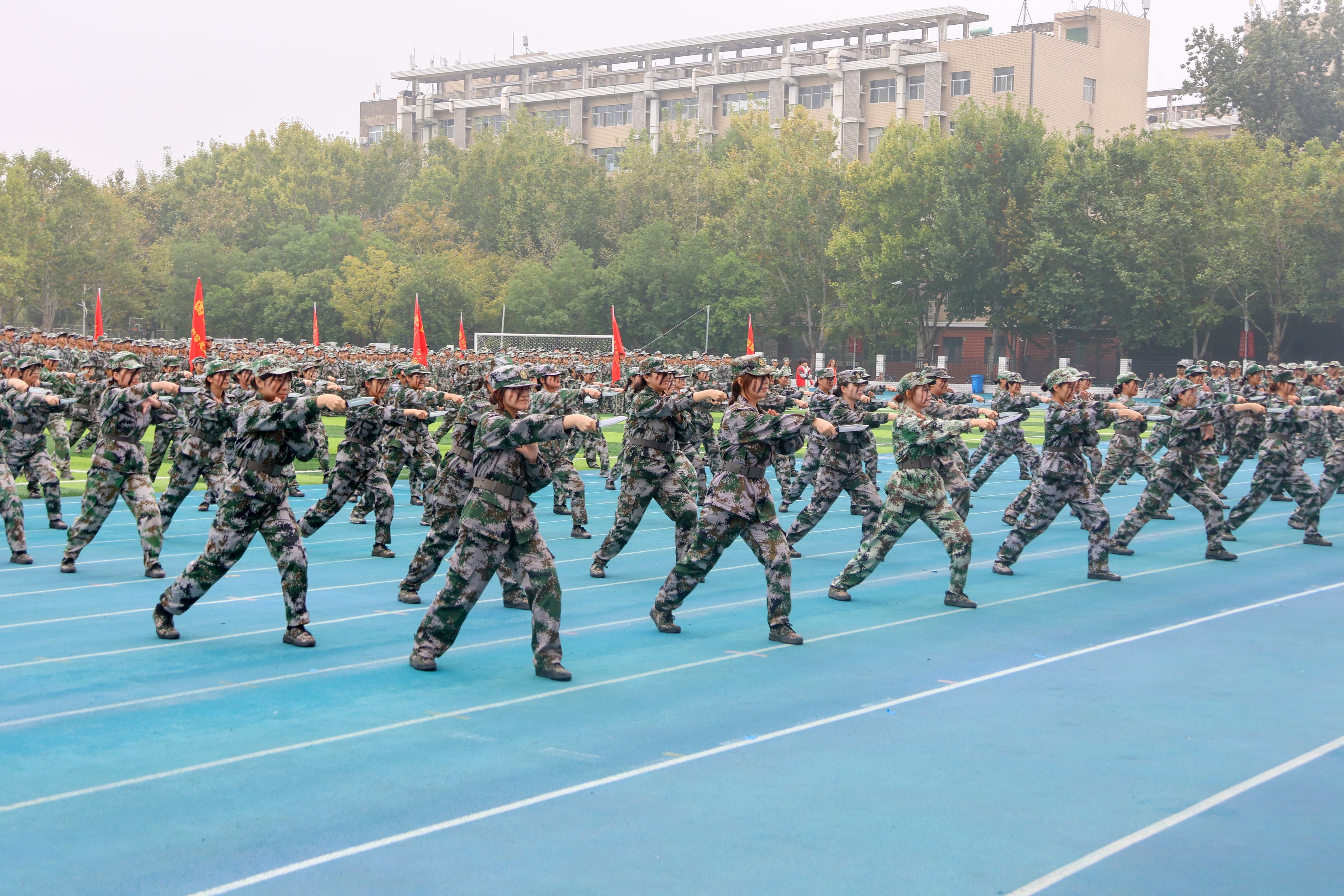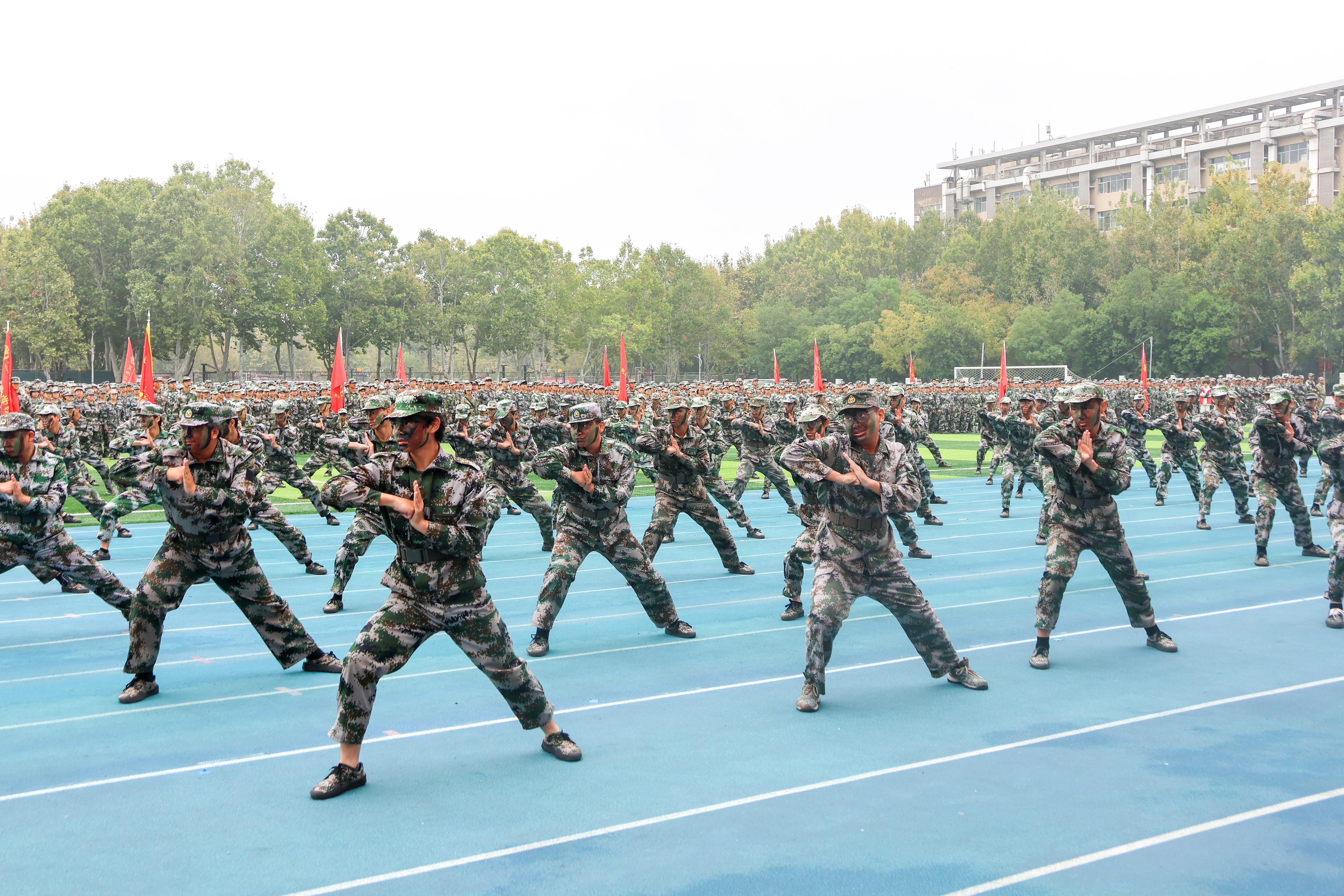 上午9时整,在庄严宏伟的国歌声中,“一校三区”大会正式拉开帷幕。随着“标兵就位”“分列式开始”的指令下达,气势磅礴的分列式进行曲响起,国旗护卫队和各校区、各院(部)组成的分列式方阵,昂首阔步依次走过主席台接受检阅,整齐划一、口号嘹亮、斗志昂扬,充分展现师大新生朝气蓬勃、积极向上的精神风貌。随后,各校区军训科目汇报展示依次进行,单兵队列动作、军体拳、匕首操、刺杀操等方队分别展示了队列动作、军体拳、战术动作、格斗基础等训练成果,全场不时爆发热烈掌声。