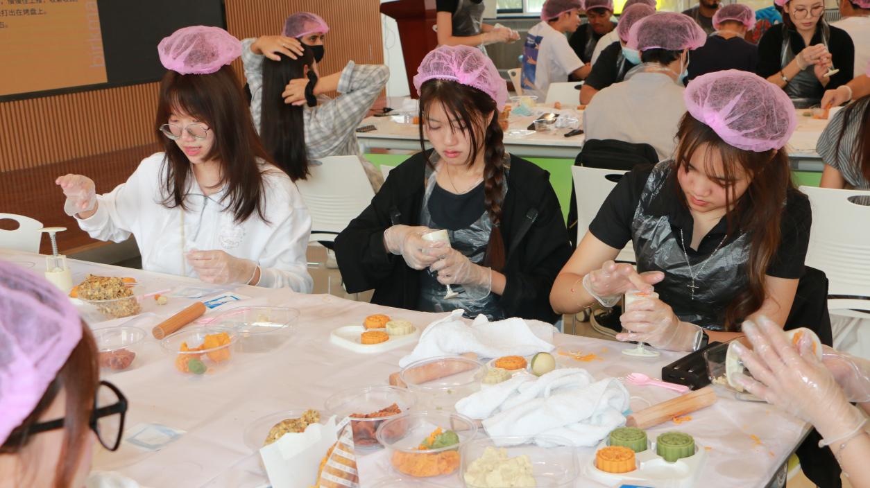 之后,手工DIY 做月饼环节将活动推向高潮。烘焙老师备好面粉、豆沙、莲蓉等材料,细致示范月饼制作流程。从揉制饼皮、包馅,到用模具压出精美花纹,每一步都吸引着留学生们专注的目光。大家迫不及待动手实践,现场气氛热烈。有人小心翼翼包裹馅料,有人反复调整模具角度。阿富汗留学生奕辰捧着形状不太规整的月饼,开心地说:“这是我第一次做月饼,太有意义了,要带回去和室友分享!”