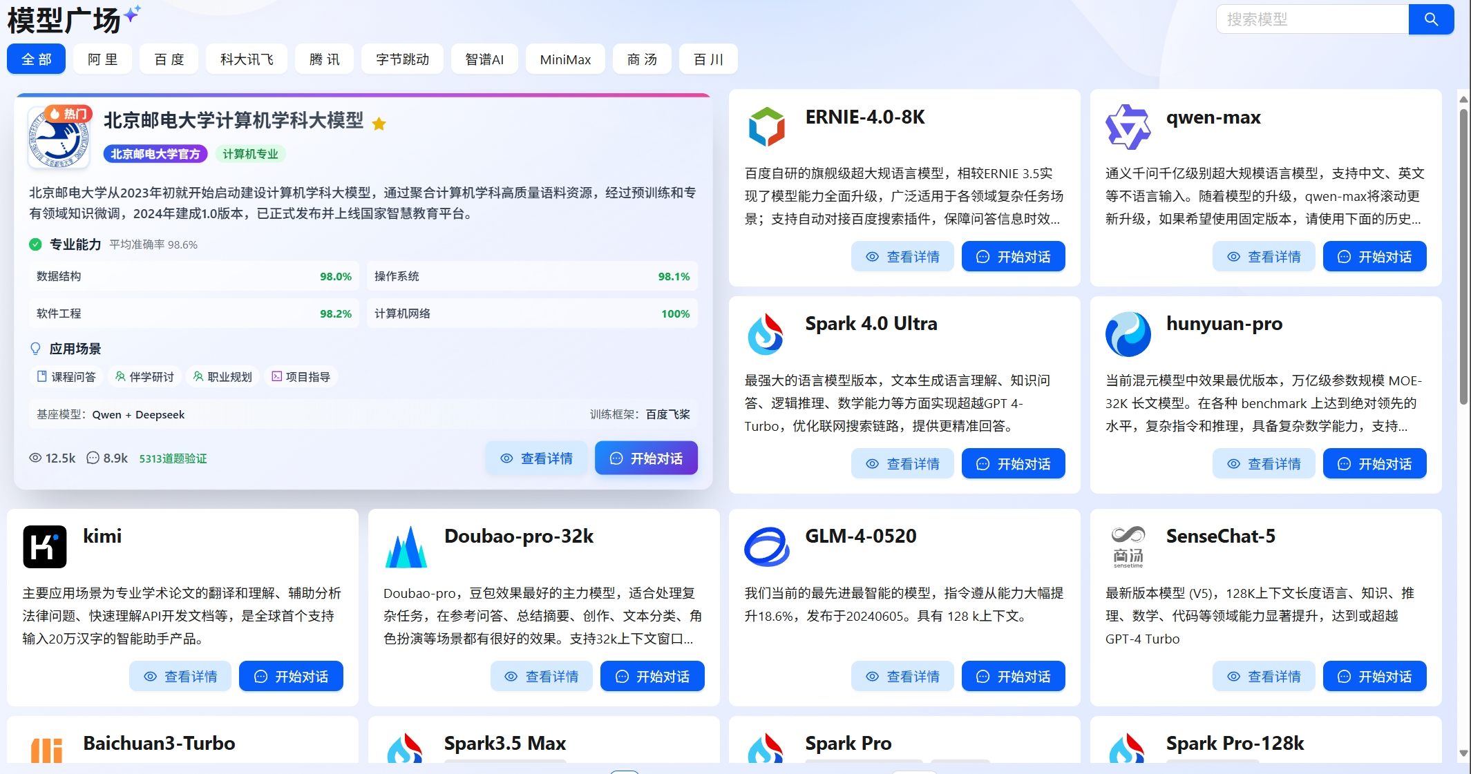 平台同时聚合DeepSeek、通义千问等百余国产主流模型,融合三大运营商异构算力资源,建成“模型星座+算力天池+数据海洋”三位一体的教育智能基座。对接中国移动“梧桐·鸿鹄”平台、中国电信实践实训平台等10个产业一线实践环境,构建“实训群峰”。平台充分发挥学校作为信息科技创新重要策源高地的科研优势,将科研势能转化为育人动能,围绕量子计算、具身智能、数据安全等20余个前沿方向,创设100个“AI+X”交叉育人案例,建设“场景园地”;面向个性化、多样化应用开发需求,开发1000余个可组合、可迭代智能体组件,构建“工具宝箱”。实现教育大模型从“资源供给”向“系统驱动”、从“工具辅助”向“生态赋能”的体系跃迁,为高等教育走向智能化生产范式提供坚实支撑。