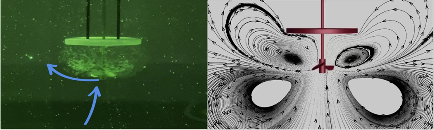 图: 实验(左)和数值模拟(右)中螺旋桨旋转时流体的运动状态