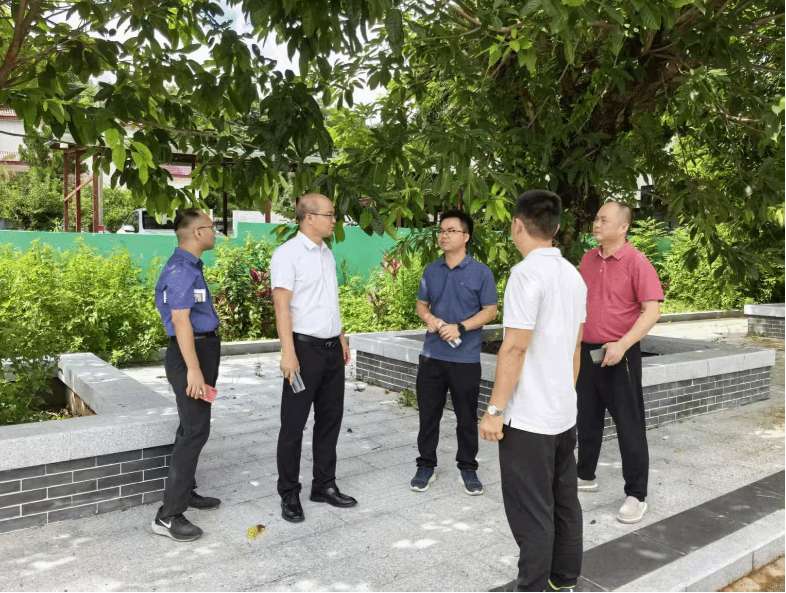 【陈伟文(右一)和翠亨新区、关塘村相关负责人在村里走访调研】