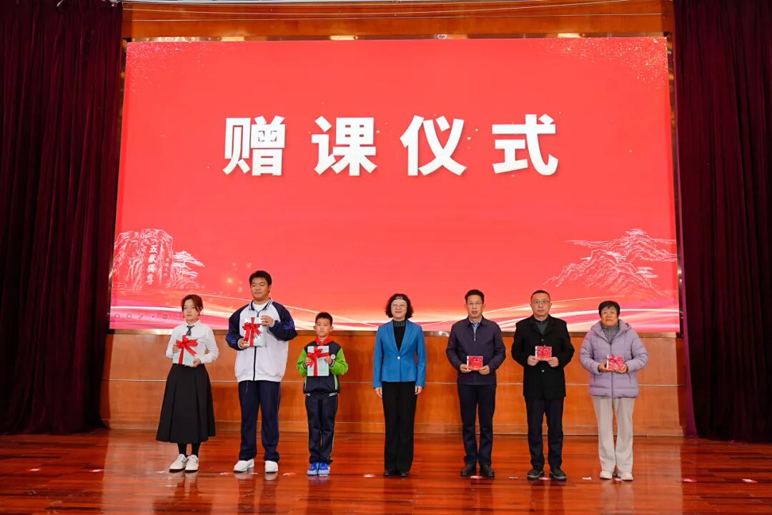 张然为泰安市大中小学思政课共同体组成单位的师生代表分别赠送“大国粮安”思政大课视频光盘和《乡村振兴齐鲁样板建设进程中的山农实践》图书资料