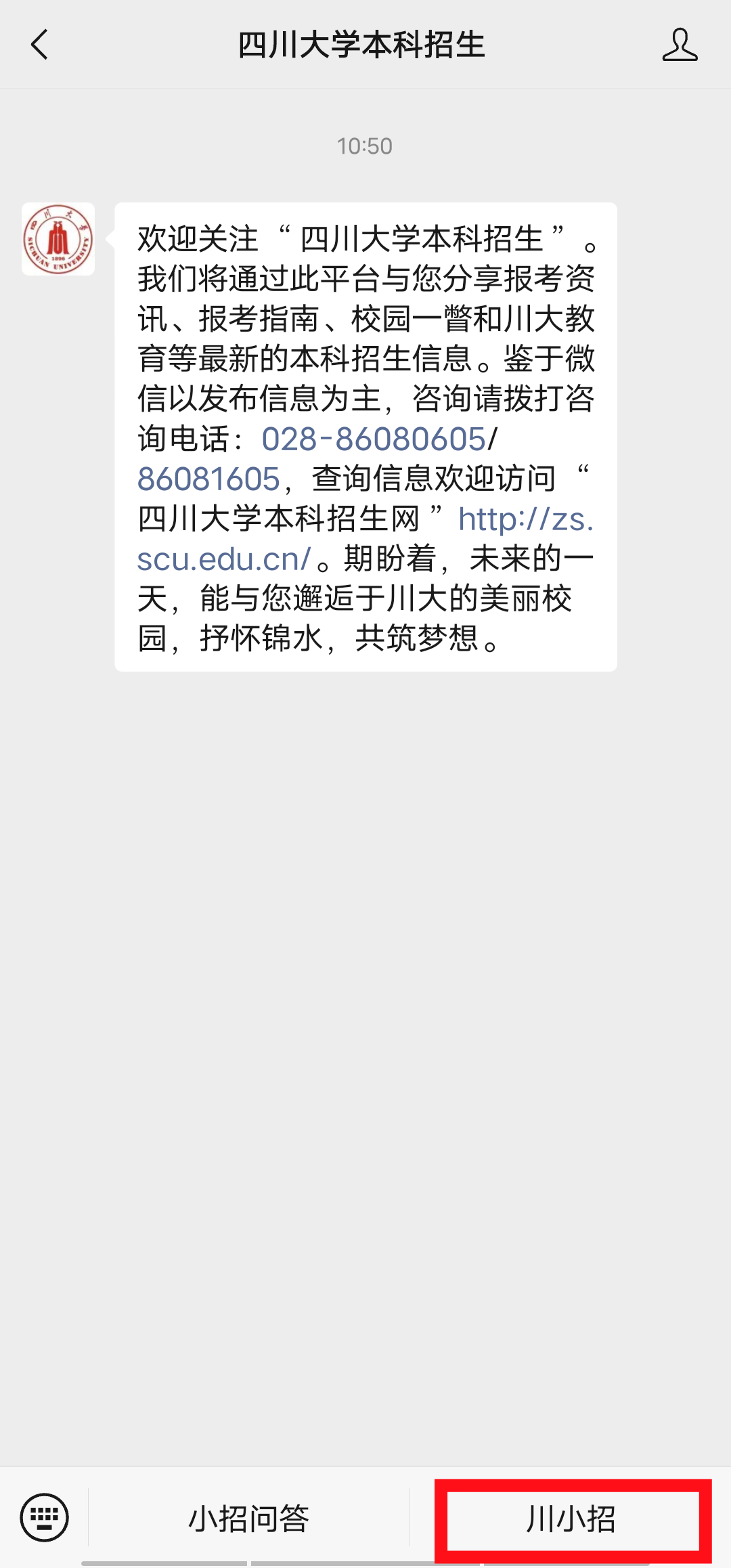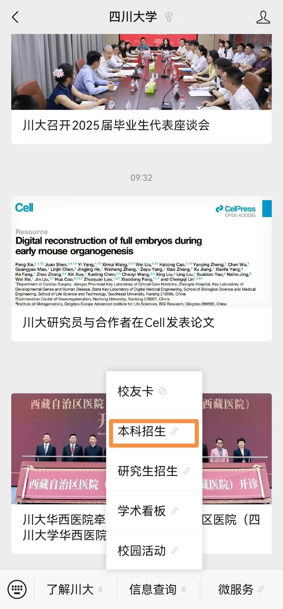 关注微信公众号“四川大学”,点击菜单栏“信息查询”里的子菜单“本科招生”,即可查询。