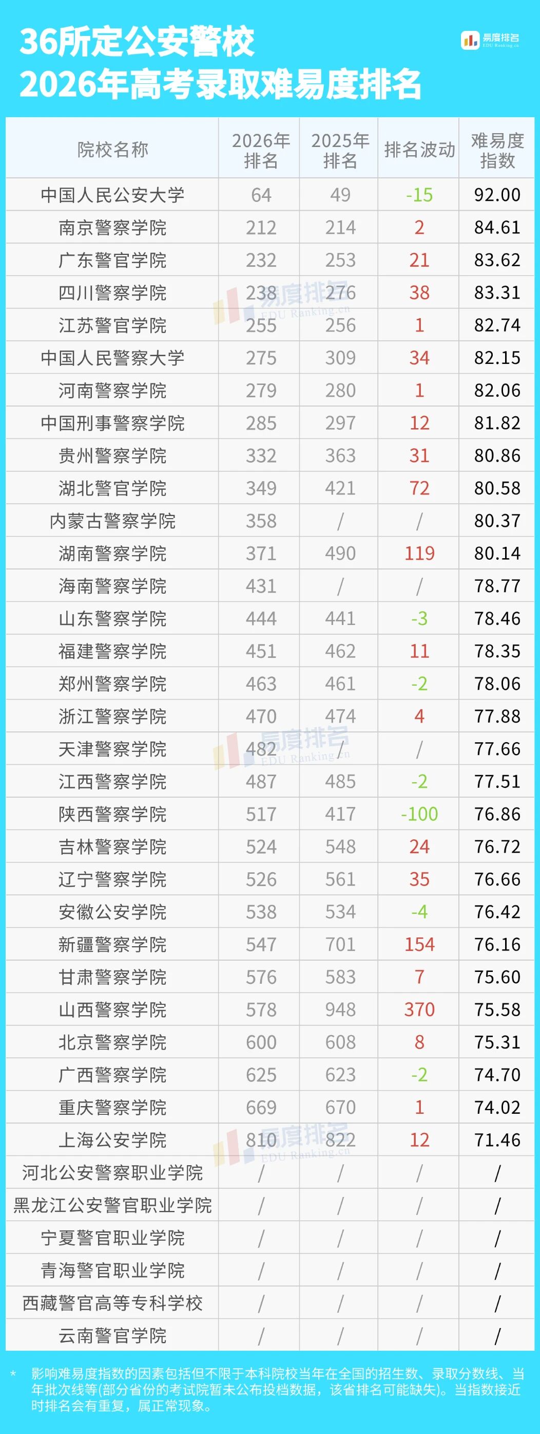 公安警校共计36所,在本科提前批、专科提前批都有招生,完整名单和排名如下(易度排名仅针对在本科批次招生的院校进行排名,故部分院校不参与排名):