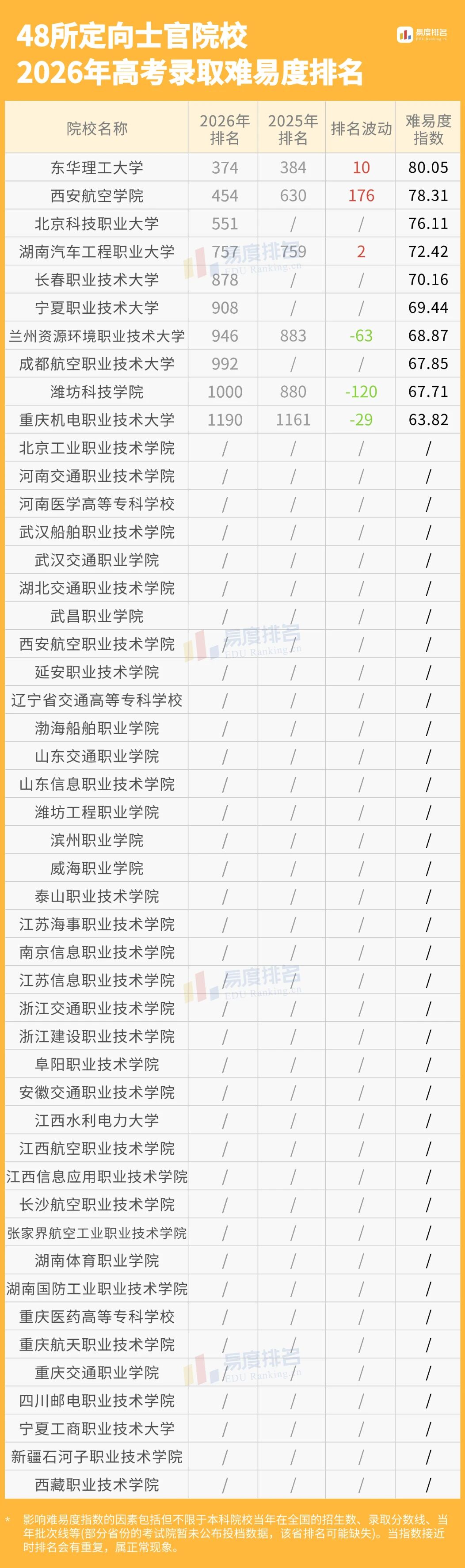 定向士官院校是“技术+就业”的双重保障。考生应优先考虑与未来军种发展紧密相关的特色专业,如航空、船舶、通信、交通等。定向士官院校分数线不算高,毕业后的入伍待遇和发展路径明确,是务实之选,48所完整名单和排名如下(易度排名仅针对在本科批次招生的院校进行排名,故部分院校不参与排名):