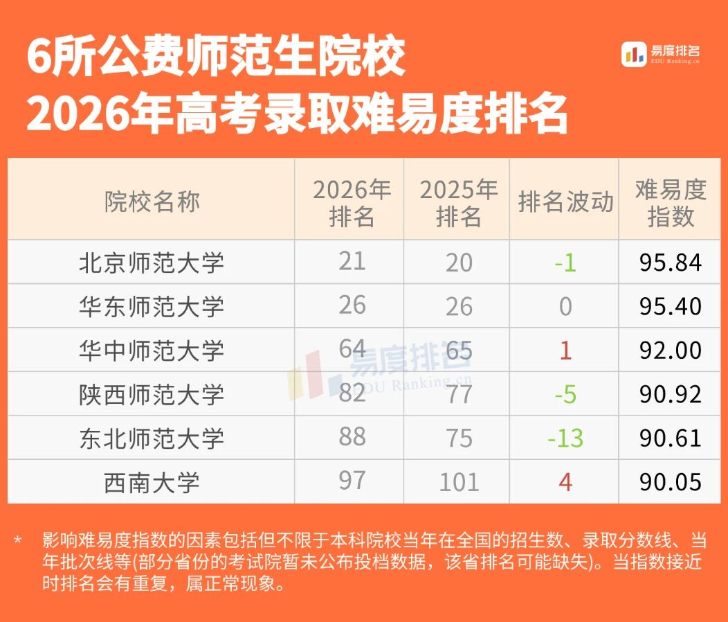 部属公费师范生项目,享受“两免一补”、确保编制等优惠政策,对追求稳定教育事业的考生吸引力巨大。六所院校全部位列全国百强,竞争异常激烈,排名波动极小,