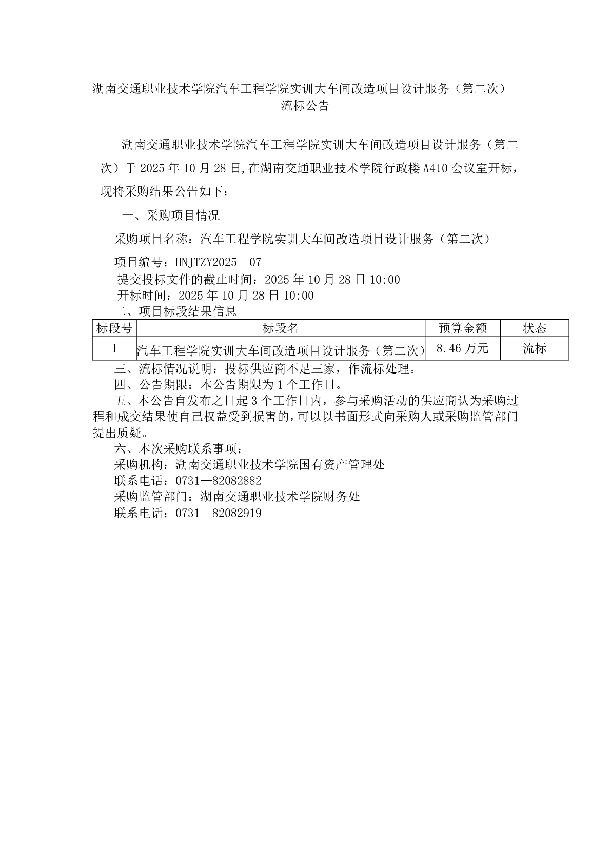 汽车工程学院实训大车间改造项目设计服务(第二次) 流标公告